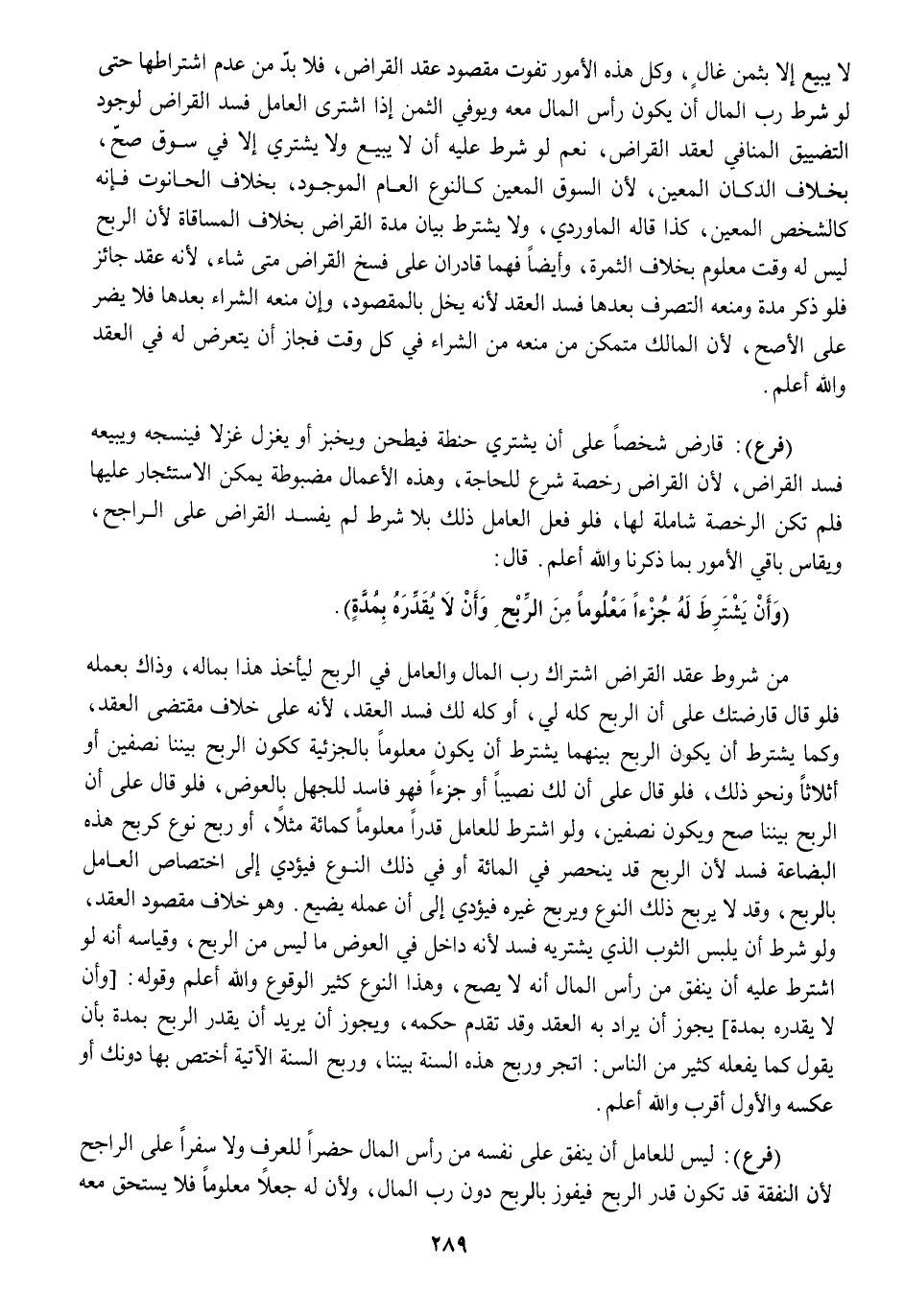 من شُرُوط عقد الْقَرَاض اشْتِرَاك رب المَال وَالْعَامِل فِي الرِّبْح ليَأْخُذ هَذَا بِمَالِه وَذَاكَ بِعَمَلِهِ فَلَو قَالَ قارضتك على أَن الرِّبْح كُله لي أَو كُله لَك فسد العقد لِأَنَّهُ على خلاف مُقْتَضى العقد وكما يشْتَرط أَن يكون الرِّبْح بَينهمَا يشْتَرط أَن يكون مَعْلُوما بالجزئية ككون الرِّبْح بَيْننَا نِصْفَيْنِ أَو أَثلَاثًا وَنَحْو ذَلِك فَلَو قَالَ على أَن لَك نَصِيبا أَو جُزْءا فَهُوَ فَاسد للْجَهْل بِالْعِوَضِ فَلَو قَالَ على أَن الرِّبْح بَيْننَا صَحَّ وَيكون نِصْفَيْنِ وَلَو اشْترط لِلْعَامِلِ قدرا مَعْلُوما كمائة مثلا أَو ربح نوع كربح هَذِه البضاعة فسد لِأَن الرِّبْح قد ينْحَصر فِي الْمِائَة أَو فِي ذَلِك النَّوْع فَيُؤَدِّي إِلَى اخْتِصَاص الْعَامِل بِالرِّبْحِ وَقد لَا يربح ذَلِك النَّوْع ويربح غَيره فَيُؤَدِّي إِلَى أَن عمله يضيع وَهُوَ خلاف مَقْصُود العقد وَلَو شَرط أَن يلبس الثَّوْب الَّذِي يَشْتَرِيهِ فسد لِأَنَّهُ دَاخل فِي الْعِوَض مَا لَيْسَ من الرِّبْح وَقِيَاسه أَنه لَو اشْترط عَلَيْهِ أَن ينْفق من رَأس المَال أَنه لَا يَصح وَهَذَا النَّوْع كثير الْوُقُوع وَالله أعلم وَقَوله وَأَن لَا يقدره بِمدَّة يجوز أَن يُرَاد بِهِ العقد وَقد تقدم حكمه وَيجوز أَن يُرِيد أَن يقدر الرِّبْح بِمدَّة بِأَن يَقُول كَمَا يَفْعَله كثير من النَّاس اتّجر وَربح هَذِه السّنة بَيْننَا وَربح السّنة الْآتِيَة أختص بهَا دُونك أَو عَكسه وَالْأول أقرب وَالله أعلم