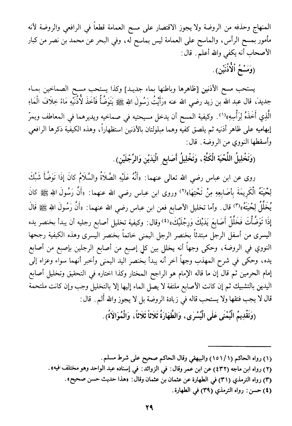 (أَن رَسُول الله صلى الله عَلَيْهِ وَسلم قَالَ إِذا تَوَضَّأت فخلل أَصَابِع يَديك ورجليك) وَقَالَ وَكَيْفِيَّة تَخْلِيل أَصَابِع رجلَيْهِ أَن يبْدَأ بخنصر يَده الْيُسْرَى من أَسْفَل الرجل مبتدئاً بخنصر الرجل الْيُمْنَى خَاتمًا بخنصر الْيُسْرَى وَهَذِه الْكَيْفِيَّة رجحها النَّوَوِيّ فِي الرَّوْضَة وَحكى وَجها أَنه يخلل بَين كل إِصْبَع من أَصَابِع الرجلَيْن بإصبع من أَصَابِع يَده وَحكى فِي شرح الْمُهَذّب وَجها آخر أَنه يبْدَأ بخنصر الْيَد الْيُمْنَى وَأخْبر أَنَّهُمَا سَوَاء وَعَزاهُ إِلَى إِمَام الْحَرَمَيْنِ ثمَّ قَالَ إِن ماقاله الإِمَام هُوَ الرَّاجِح الْمُخْتَار وَكَذَا اخْتَارَهُ فِي التَّحْقِيق وتخليل الْأَصَابِع الْيَدَيْنِ بالتشبيك ثمَّ إِن كَانَت الْأَصَابِع ملتفة لَا يصل المَاء إِلَيْهَا بالتخليل وَجب وَإِن كَانَت ملتحمة قَالَ لَا يجب فتقها وَلَا يسْتَحبّ قَالَه فِي الزِّيَادَة الرَّوْضَة بل لَا يجوز وَالله أعلم قَالَ
