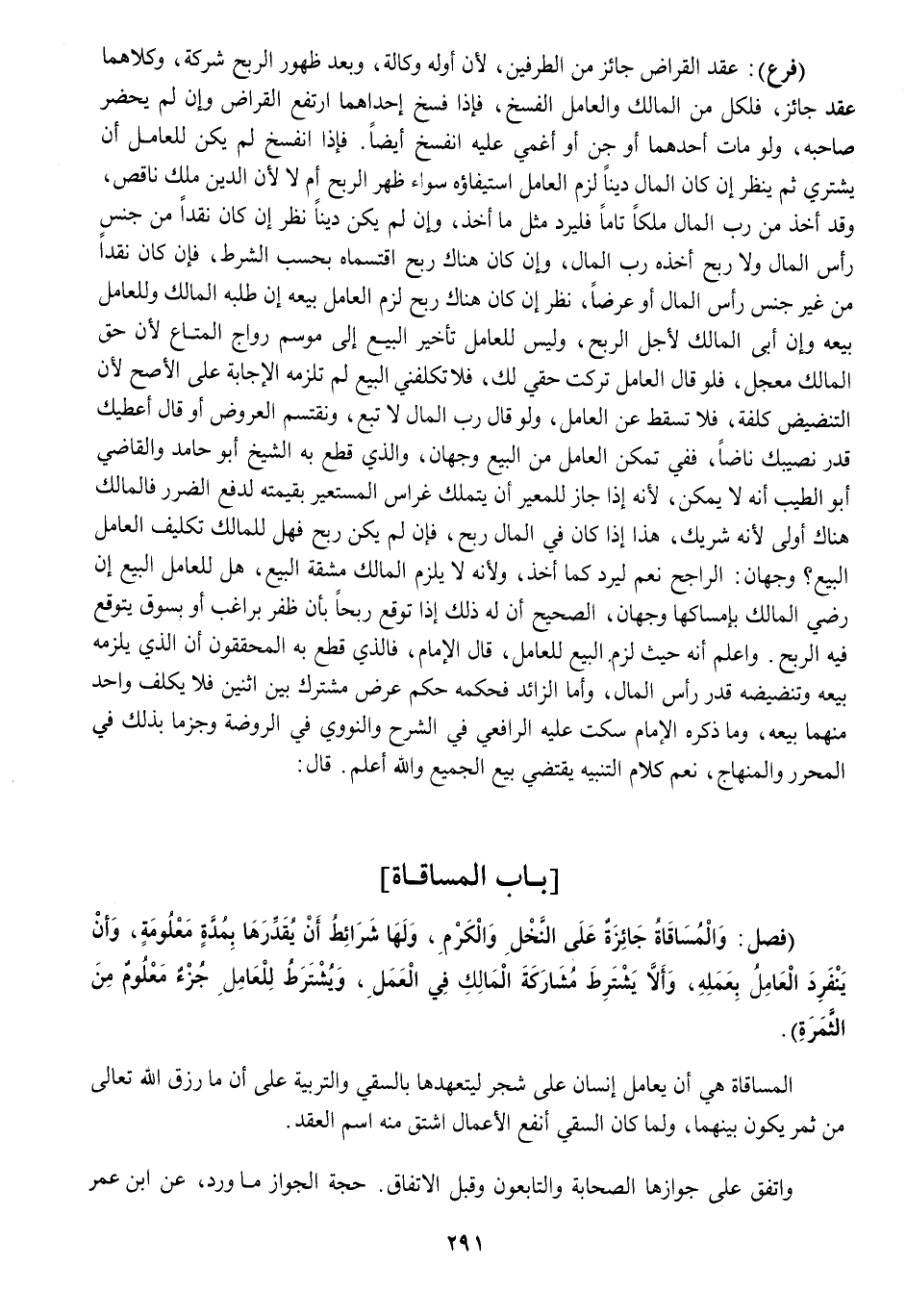 بَاب الْمُسَاقَاة فصل وَالْمُسَاقَاة جَائِزَة على النّخل وَالْكَرم وَلها شَرَائِط أَن يقدرها بِمدَّة مَعْلُومَة وَأَن ينْفَرد الْعَامِل بِعَمَلِهِ وَألا يشْتَرط مُشَاركَة الْمَالِك فِي الْعَمَل وَيشْتَرط لِلْعَامِلِ جُزْء مَعْلُوم من الثَّمَرَة