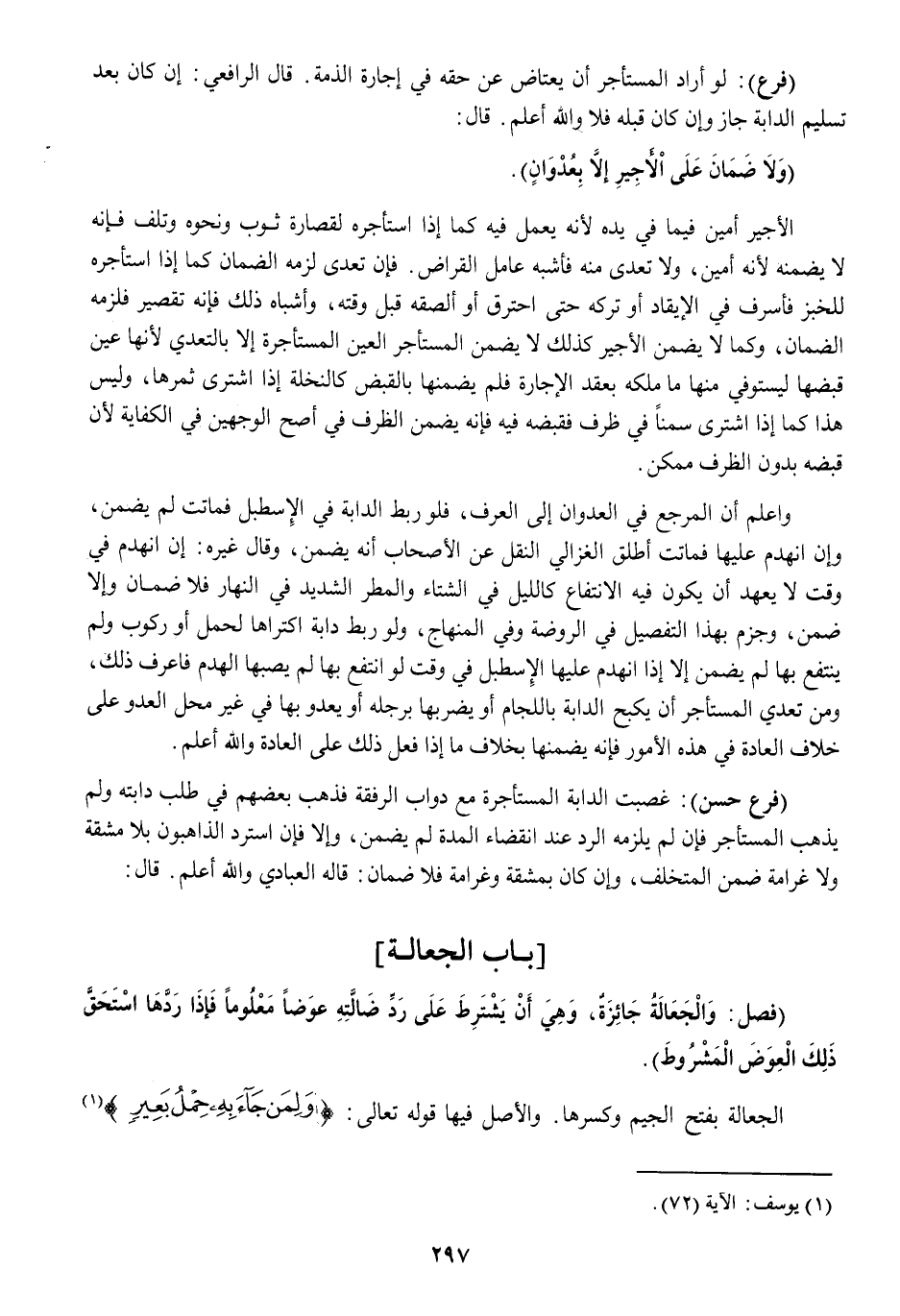 بَاب الْجعَالَة فصل والجعالة جَائِزَة وَهِي أَن يشْتَرط على رد ضالته عوضا مَعْلُوما فَإِذا ردهَا اسْتحق ذَلِك الْعِوَض الْمَشْرُوط