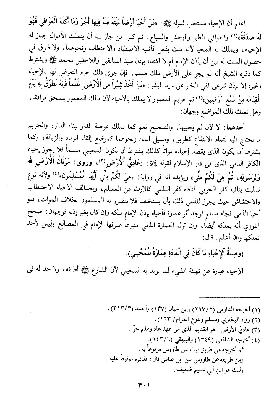 (أَحْيَا أَرضًا ميتَة فَلهُ أجر وَمَا أكله العوافي فَهُوَ لَهُ صَدَقَة) والعوافي الطير والوحش وَالسِّبَاع ثمَّ كل من جَازَ لَهُ أَن يتَمَلَّك الْأَمْوَال جَازَ لَهُ الْإِحْيَاء وَيملك بِهِ الْمحيا لِأَنَّهُ ملك بِفعل فَأشبه الِاصْطِيَاد والاحتطاب وَنَحْوهمَا وَلَا فرق فِي حُصُول الْملك لَهُ بَين أَن يَأْذَن الإِمَام أم لَا اكْتِفَاء بِإِذن سيد السَّابِقين واللاحقين مُحَمَّد صلى الله عَلَيْهِ وَسلم وَيشْتَرط كَمَا ذكره الشَّيْخ أَنه لم يجر على الأَرْض ملك مُسلم فَإِن جرى ذَلِك حرم التَّعَرُّض لَهَا بالأحياء وَغَيره إِلَّا بِإِذن شَرْعِي فَفِي الْخَبَر عَن سيد الْبشر