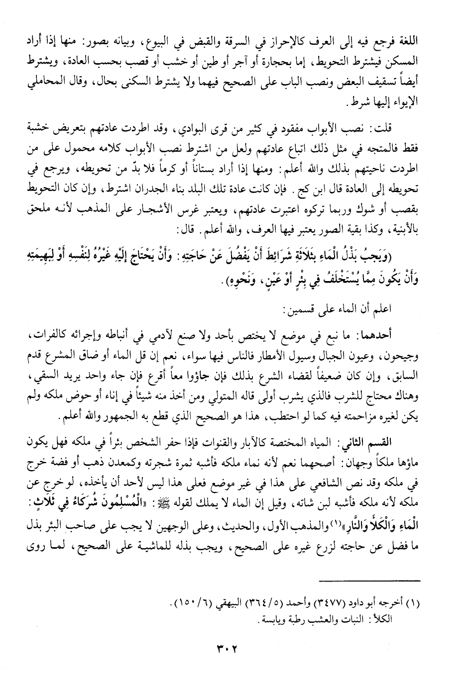 (الْمُسلمُونَ شُرَكَاء فِي ثَلَاث المَاء والكلأ وَالنَّار) وَالْمذهب الأول والْحَدِيث وعَلى الْوَجْهَيْنِ لَا يجب على صَاحب الْبِئْر بذل مَا فضل عَن حَاجته لزرع غَيره على الصَّحِيح وَيجب بذله للماشية على الصَّحِيح لما روى