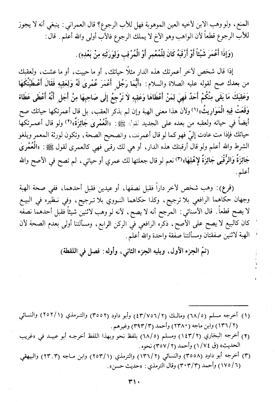 (أَيّمَا رجل أعمر عمرى لَهُ ولعقبه فَقَالَ أعطيتكها وَعَقِبك مَا بقى مِنْكُم أحد فَهِيَ لمن أَعْطَاهَا وعقبه لَا ترجع إِلَى صَاحبهَا من أجل أَنه أعْطى عَطاء وَقعت فِيهِ الْمَوَارِيث) وَلِأَن هَذَا معنى الْهِبَة وَإِن لم يذكر الْعقب بل قَالَ أعمرتكها حياتك صَحَّ أَيْضا فِي حَيَاته ولعقبه من بعده على الْجَدِيد لقَوْله صلى الله عَلَيْهِ وَسلم