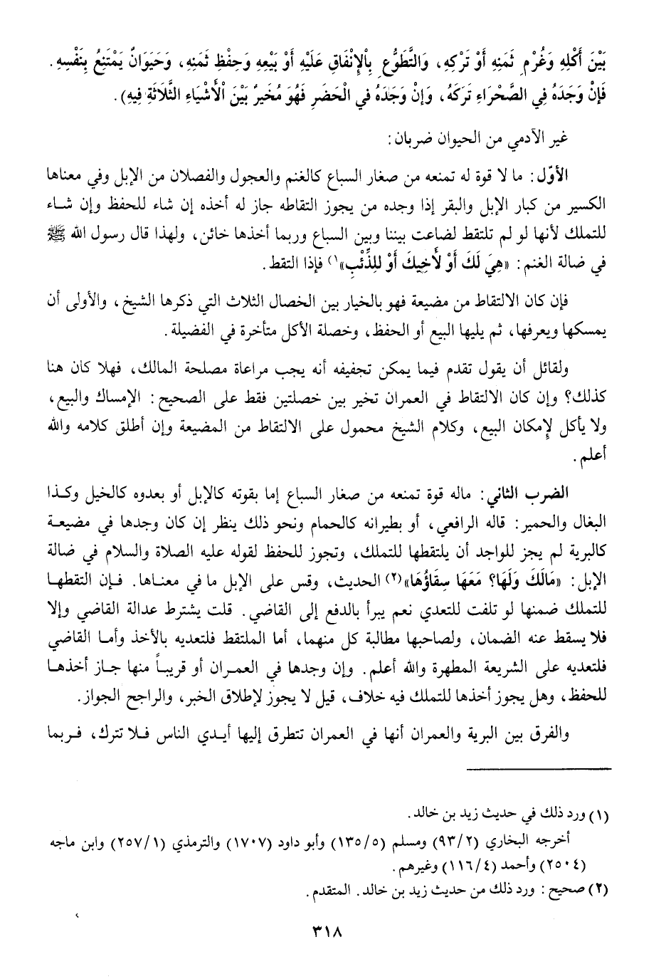بَين أكله وَغرم ثمنه أَو تَركه والتطوع بالانفاق عَلَيْهِ أَو بَيْعه وَحفظ ثمنه وحيوان يمْتَنع بِنَفسِهِ فَإِن وجده فِي الصَّحرَاء تَركه وَإِن وجده فِي الْحَضَر فَهُوَ مُخَيّر بَين الْأَشْيَاء الثَّلَاثَة فِيهِ)