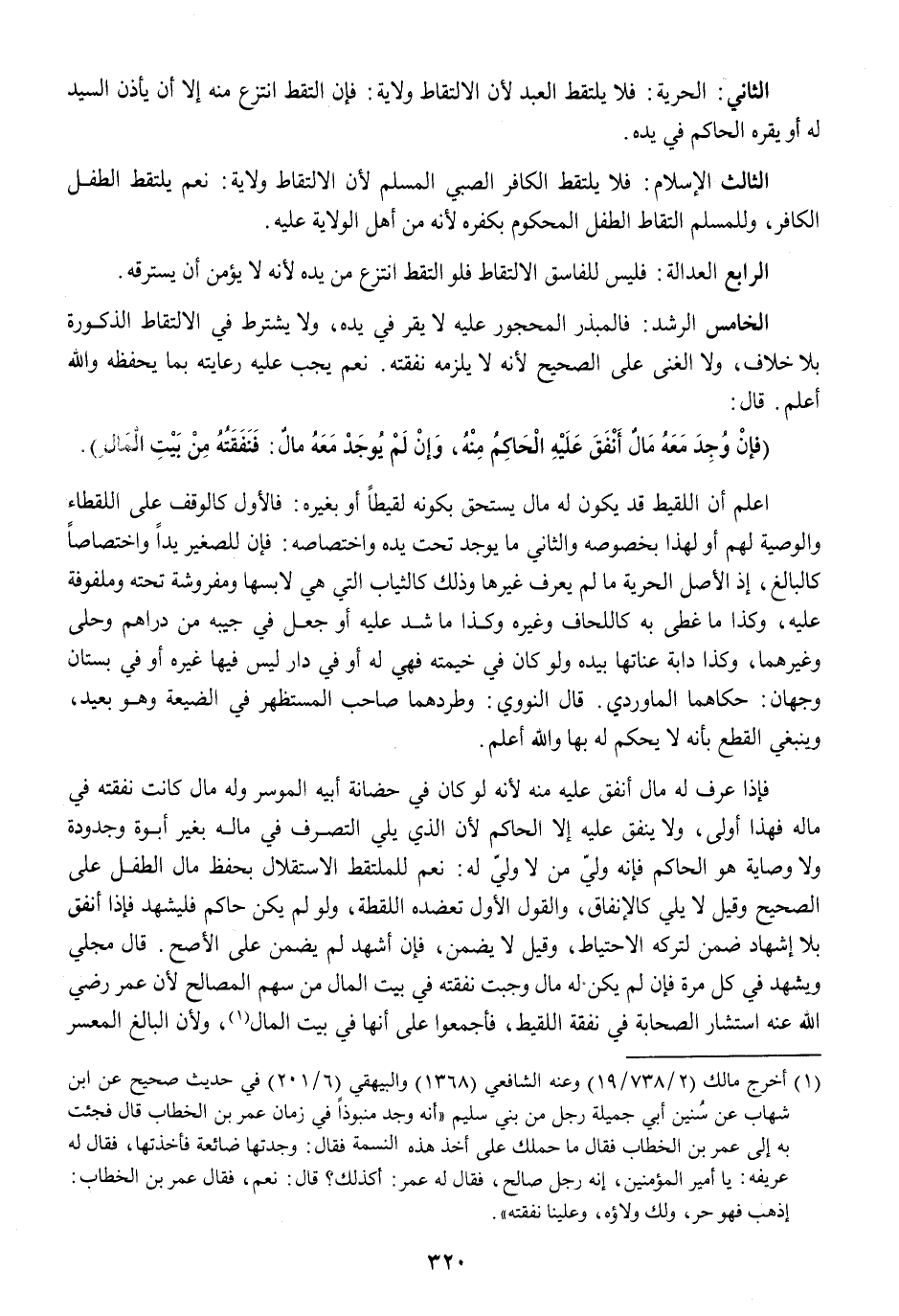الثَّانِي الْحُرِّيَّة فَلَا يلتقط العَبْد لِأَن الِالْتِقَاط ولَايَة فَإِن الْتقط انتزع مِنْهُ إِلَّا أَن يَأْذَن السَّيِّد لَهُ أَو يقره الْحَاكِم فِي يَده