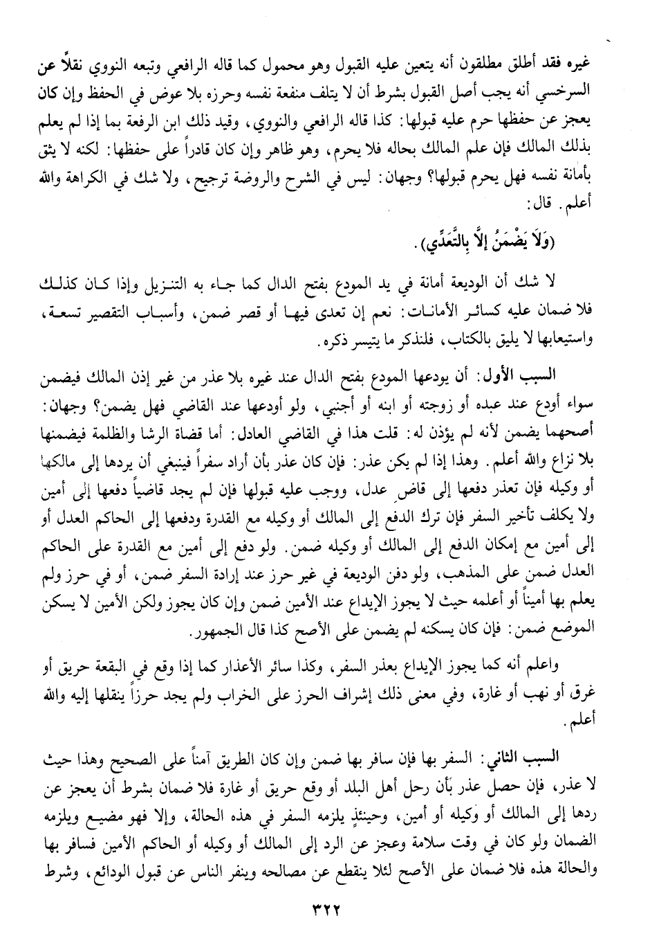 لَا شكّ أَن الْوَدِيعَة أَمَانَة فِي يَد الْمُودع بِفَتْح الدَّال كَمَا جَاءَ بِهِ التَّنْزِيل وَإِذا كَانَ كَذَلِك فَلَا ضَمَان عَلَيْهِ كَسَائِر الْأَمَانَات نعم إِن تعدِي فِيهَا أَو قصر ضمن وَأَسْبَاب التَّقْصِير تِسْعَة واستيعابها لَا يَلِيق بِالْكتاب فلنذكر مَا يَتَيَسَّر ذكره