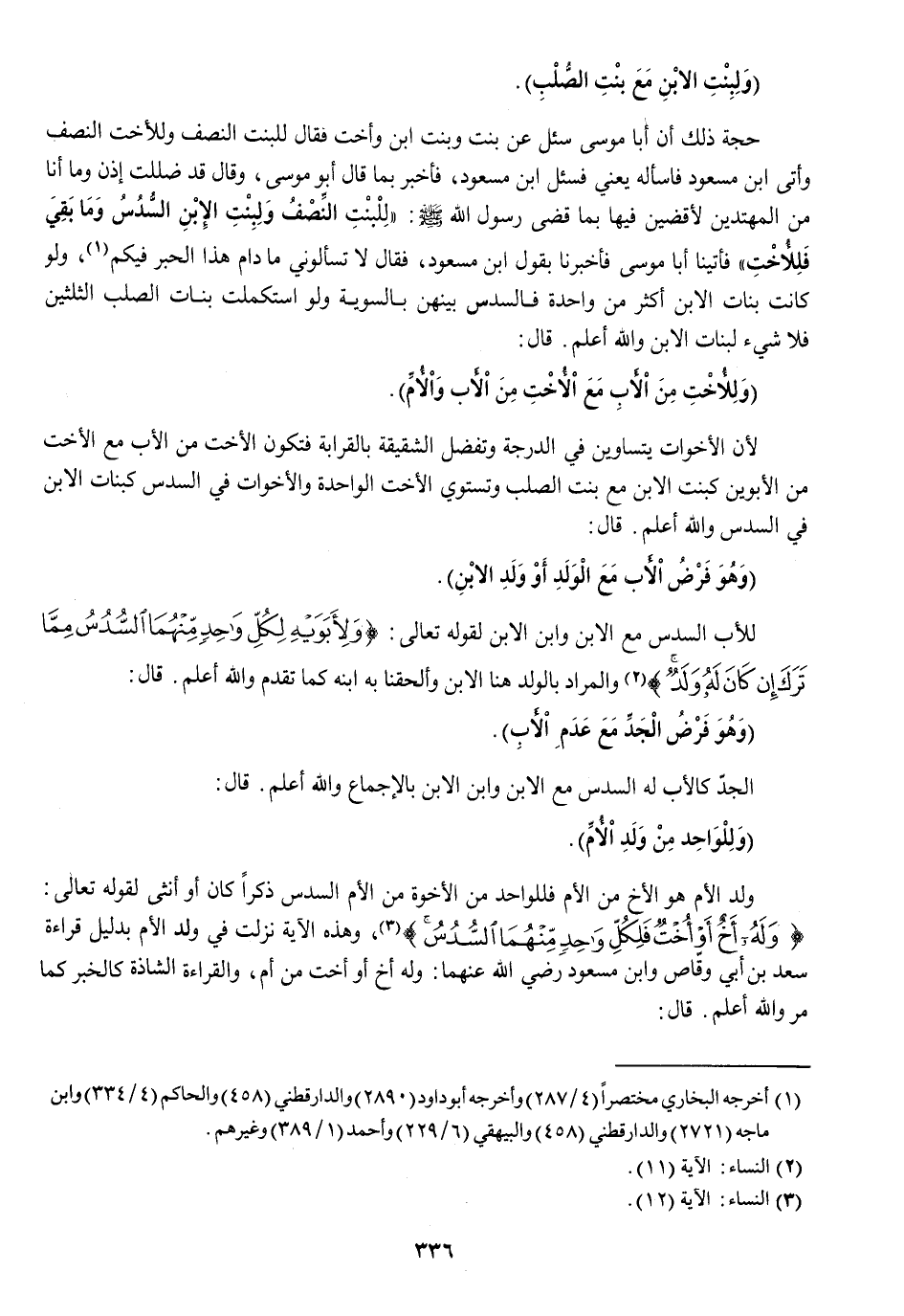 حجَّة ذَلِك أَن أَبَا مُوسَى سُئِلَ عَن بنت وَبنت ابْن وَأُخْت فَقَالَ للْبِنْت النّصْف وَللْأُخْت النّصْف وأتى ابْن مَسْعُود فَاسْأَلْهُ يَعْنِي فَسئلَ ابْن مَسْعُود فَأخْبر بِمَا قَالَ أَبُو مُوسَى وَقَالَ قد ضللت إِذا وَمَا أَنا من المهتدين لأقضين فِيهَا بِمَا قضى رَسُول الله صلى الله عَلَيْهِ وَسلم ((للْبِنْت النّصْف ولبنت الابْن السُّدس وَمَا بَقِي فللأخت)) فأتينا أَبَا مُوسَى فَأخْبرنَا بقول ابْن مَسْعُود فَقَالَ لَا تَسْأَلُونِي مَا دَامَ هَذَا الحبر فِيكُم وَلَو كَانَت بَنَات الابْن أَكثر من وَاحِدَة فالسدس بَينهُنَّ بِالسَّوِيَّةِ وَلَو استكملت بَنَات الصلب الثُّلثَيْنِ فَلَا شَيْء لبنات الابْن وَالله أعلم قَالَ