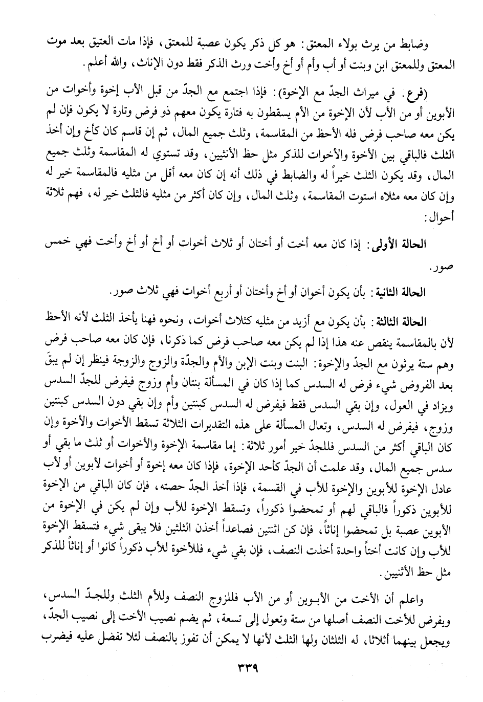 (فرع فِي مِيرَاث الْجد مَعَ الْأُخوة) فَإِذا اجْتمع مَعَ الْجد من قبل الْأَب أخوة وأخوات من الْأَبَوَيْنِ أَو من الْأَب لِأَن الْأُخوة من الْأُم يسقطون بِهِ فَتَارَة يكون مَعَهم ذُو فرض وَتارَة لَا يكون فَإِن لم يكن مَعَه صَاحب فرض فَلهُ الأحظ من الْمُقَاسَمَة وَثلث جَمِيع المَال ثمَّ إِن قَاسم كَانَ كأخ وَإِن أَخذ الثُّلُث فالباقي بَين الْأُخوة وَالْأَخَوَات للذّكر مثل حَظّ الْأُنْثَيَيْنِ وَقد تستوي لَهُ الْمُقَاسَمَة وَثلث جَمِيع المَال وَقد يكون الثُّلُث خيرا لَهُ وَالضَّابِط فِي ذَلِك أَنه إِن كَانَ مَعَه أقل من مثلَيْهِ فالمقاسمة خير لَهُ وَإِن كَانَ مَعَه مثلاه اسْتَوَت الْمُقَاسَمَة وَثلث المَال وَإِن كَانَ أَكثر من مثلَيْهِ فَالثُّلُث خير لَهُ فهم ثَلَاثَة أَحْوَال
