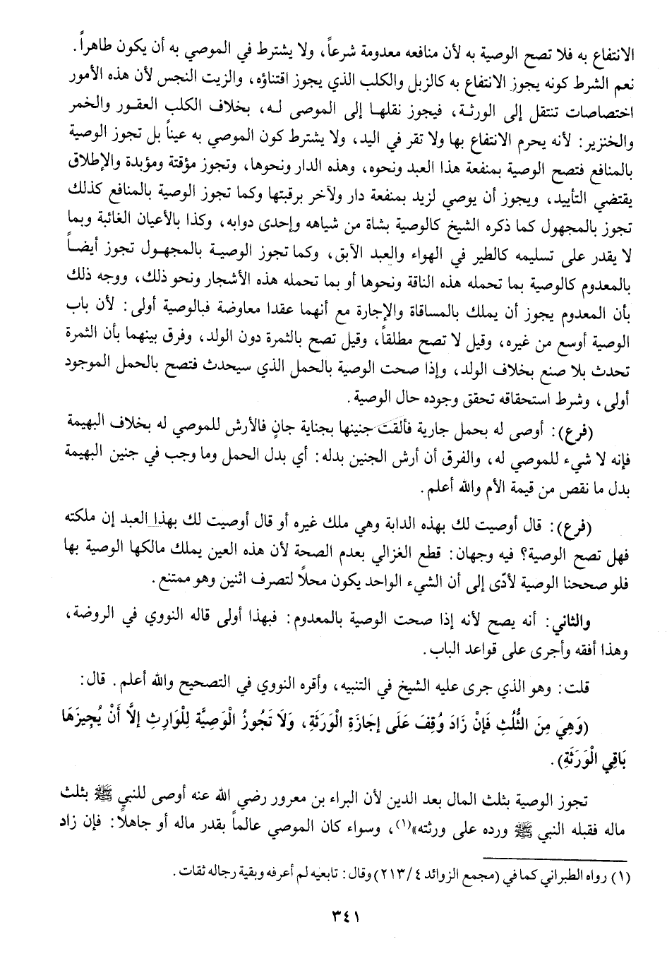 الِانْتِفَاع بِهِ فَلَا تصح الْوَصِيَّة بِهِ لِأَن مَنَافِعه مَعْدُومَة شرعا وَلَا يشْتَرط فِي الْمُوصى بِهِ أَن يكون طَاهِرا نعم الشَّرْط كَونه يجوز الِانْتِفَاع بِهِ كالزبل وَالْكَلب الَّذِي يجوز اقتناؤه وَالزَّيْت النَّجس لِأَن هَذِه الْأُمُور اختصاصات تنْتَقل إِلَى الْوَرَثَة فَيجوز نقلهَا إِلَى الْمُوصى لَهُ بِخِلَاف الْكَلْب الْعَقُور وَالْخمر وَالْخِنْزِير لِأَنَّهُ يحرم الِانْتِفَاع بهَا وَلَا تقر فِي الْيَد وَلَا يشْتَرط كَون الْمُوصى بِهِ عينا بل تجوز الْوَصِيَّة بالمنافع فَتَصِح الْوَصِيَّة بِمَنْفَعَة هَذَا العَبْد وَنَحْوه دَار وَلآخر برقبتها وكما تجوز الْوَصِيَّة بالمنافع كَذَلِك تجوز بِالْمَجْهُولِ كَمَا ذكره الشَّيْخ كَالْوَصِيَّةِ بِشَاة من شياهه واحدى دوابه وَكَذَا بالأعيان الغائبة وَبِمَا لَا يقدر على تَسْلِيمه كالطير فِي الْهَوَاء وَالْعَبْد الْآبِق وكما تجوز الْوَصِيَّة بِالْمَجْهُولِ تجوز أَيْضا بالمعدوم كَالْوَصِيَّةِ بِمَا تحمله هَذِه النَّاقة وَنَحْوهَا أَو بِمَا تحمله هَذِه الْأَشْجَار وَنَحْو ذَلِك وَوجه ذَلِك بِأَن الْمَعْدُوم يجوز أَن يملك بالمساقاة والاجارة مَعَ أَنَّهُمَا عقدا مُعَارضَة فبالوصية أولى لِأَن بَاب الْوَصِيَّة أوسع من غَيره وَقيل لَا تصح مُطلقًا وَقيل تصح بالثمرة دون الْوَلَد وَفرق بَينهمَا بِأَن الثَّمَرَة تحدث بِلَا صنع بِخِلَاف الْوَلَد وَإِذا صحت الْوَصِيَّة بِالْحملِ الَّذِي سيحدث فَتَصِح بِالْحملِ الْمَوْجُود أولى وَشرط اسْتِحْقَاقه تحقق وجوده حَال الْوَصِيَّة