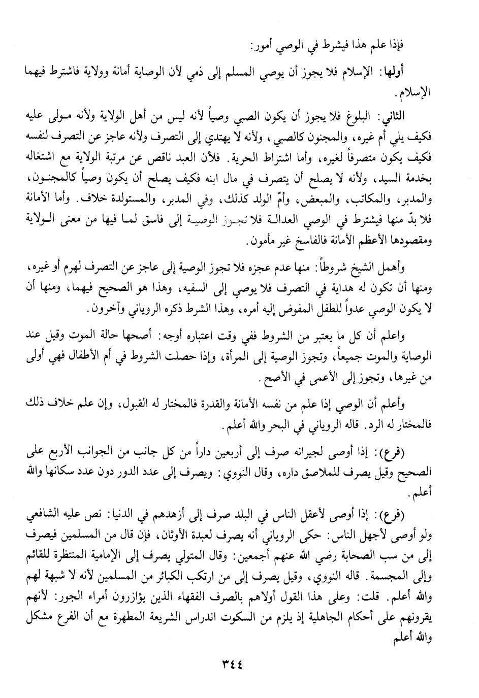 الثَّانِي الْبلُوغ فَلَا يجوز أَن يكون الصَّبِي وَصِيّا لِأَنَّهُ لَيْسَ من أهل الْولَايَة وَلِأَنَّهُ مولى عَلَيْهِ فَكيف يَلِي أم غَيره وَالْمَجْنُون كَالصَّبِيِّ لِأَنَّهُ لَا يَهْتَدِي إِلَى التَّصَرُّف وَلِأَنَّهُ عَاجز عَن التَّصَرُّف لنَفسِهِ فَكيف يكون متصرفاً لغيره وَأما اشْتِرَاط الْحُرِّيَّة فَلِأَن العَبْد نَاقص عَن مرتبَة الْولَايَة مَعَ اشْتِغَاله بِخِدْمَة السَّيِّد وَلِأَنَّهُ لَا يصلح أَن يتَصَرَّف فِي مَال ابْنه فَكيف يصلح أَن يكون وَصِيّا كَالْمَجْنُونِ وَالْمُدبر وَالْمكَاتب والمبغض وَأم الْوَلَد كَذَلِك وَفِي الْمُدبر والمستولدة خلاف وَأما الْأَمَانَة فَلَا بُد مِنْهَا فَيشْتَرط فِي الْوَصِيّ الْعَدَالَة فَلَا تجوز الْوَصِيَّة إِلَى فَاسق لما فِيهَا من معنى الْولَايَة ومقصودها الْأَعْظَم الْأَمَانَة فالفاسخ غير مَأْمُون