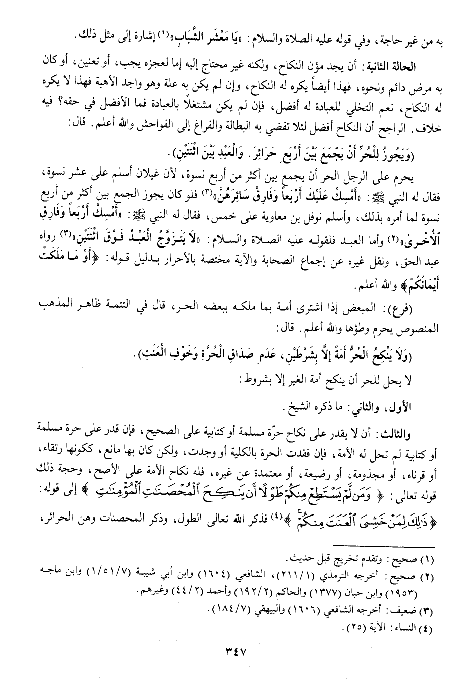 يحرم على الرجل الْحر أَن يجمع بَين أَكثر من أَربع نسْوَة لِأَن غيلَان أسلم على عشر نسْوَة فَقَالَ لَهُ النَّبِي صلى الله عَلَيْهِ وَسلم أمسك عَلَيْك أَرْبعا وَفَارق سائرهن فَلَو كَانَ يجوز الْجمع بَين أَكثر من أَربع نسْوَة لما أمره بذلك وَأسلم نَوْفَل بن مُعَاوِيَة على خمس فَقَالَ لَهُ النَّبِي صلى الله عَلَيْهِ وَسلم أمسك أَرْبعا وَفَارق الْأُخْرَى وَأما العَبْد فَلقَوْله عَلَيْهِ الصَّلَاة وَالسَّلَام لَا يتَزَوَّج العَبْد فَوق اثْنَتَيْنِ رَوَاهُ عبد الْحق وَنقل غَيره عَن إِجْمَاع الصَّحَابَة وَالْآيَة مُخْتَصَّة بالأحرار بِدَلِيل قَوْله {أَوْ مَا مَلَكَتْ أَيْمَانُكُمْ} وَالله أعلم