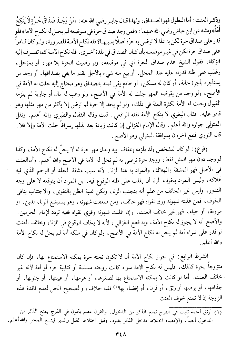الشَّرْط الرَّابِع فِي جَوَاز نِكَاح الْأمة أَن لَا تكون تَحْتَهُ حرَّة يُمكنهُ الِاسْتِمْتَاع بهَا فَإِن كَانَ متزوجاً بحرة كَذَلِك فَلَيْسَ لَهُ نِكَاح الْأمة سَوَاء كَانَت زَوجته مسلمة أَو كِتَابِيَّة حرَّة أَو أمة لِأَنَّهُ غير خَائِف الْعَنَت أما لَو كَانَت لَا يُمكنهُ الِاسْتِمْتَاع بهَا لصغرها أَو هرمها أَو غيبتها أَو جنونها أَو جذامها أَو برصها أَو رتق أَو قرن أَو إفضاء بهَا فَفِيهِ خلاف وَالصَّحِيح الْحل لعدم فَائِدَة هَذِه الزوجه إِذا لَا تمنع خوف الْعَنَت