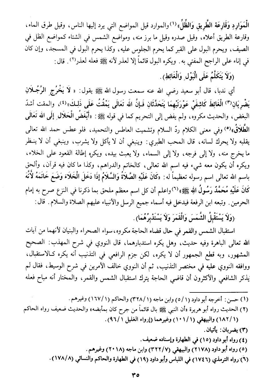 الْمَوَارِد وقارعة الطَّرِيق والظل) والموارد قيل الْمَوَاضِع الَّتِي يرد النَّاس إِلَيْهَا وَقيل طرق المَاء وقارعة الطَّرِيق أَعْلَاهُ وَقيل صَدره وَقيل مَا برز مِنْهُ ومواضع الشَّمْس فِي الشتَاء كمواضع الظل فِي الصَّيف وَيحرم الْبَوْل على الْقَبْر كَمَا يحرم الْجُلُوس عَلَيْهِ وَكَذَا يحرم الْبَوْل فِي الْمَسْجِد وَإِن كَانَ فِي إِنَاء على الرَّاجِح الْمُفْتى بِهِ وَيكرهُ الْبَوْل قَائِما إِلَّا لعذر لِأَنَّهُ فعله لعذر قَالَ