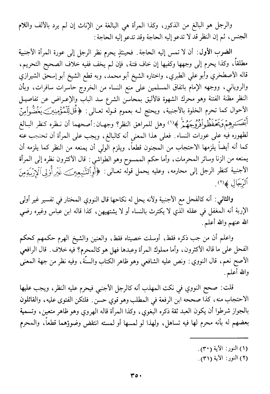 الضَّرْب الأول أَن لَا تمس إِلَيْهِ الْحَاجة فَحِينَئِذٍ يحرم نظر الرجل إِلَى عَورَة الْمَرْأَة الْأَجْنَبِيَّة مُطلقًا وَكَذَا يحرم إِلَى وَجههَا وكفيها إِن خَافَ فتْنَة فَإِن لم يخف فَفِيهِ خلاف الصَّحِيح التَّحْرِيم قَالَه الاصطخري وَأَبُو عَليّ الطَّبَرِيّ وَاخْتَارَهُ الشَّيْخ أَبُو مُحَمَّد وَبِه قطع الشَّيْخ أَبُو إِسْحَاق الشِّيرَازِيّ وَالرُّويَانِيّ وَوَجهه الإِمَام بِاتِّفَاق الْمُسلمين على منع النِّسَاء من الْخُرُوج حاسرات سافرات وَبِأَن النّظر مَظَنَّة الْفِتْنَة وَهُوَ محرك الشَّهْوَة فالأليق بمحاسن الشَّرْع سد الْبَاب والاعراض عَن تفاصيل الْأَحْوَال كَمَا تحرم الْخلْوَة بالأجنبية ويحتج لَهُ بِعُمُوم قَوْله تَعَالَى {قُلْ لِلْمُؤْمِنِينَ يَغُضُّوا مِنْ أَبْصَارِهِمْ وَيَحْفَظُوا فُرُوجَهُمْ} وَهل للمراهق النّظر وَجْهَان أصَحهمَا أَن نظره كنظر الْبَالِغ لظُهُوره فِيهِ على عورات النِّسَاء فعلى هَذَا الْمَعْنى أَنه كَالْبَالِغِ وَيجب على الْمَرْأَة أَن تحتجب عَنهُ كَمَا أَنه أَيْضا يلْزمهَا الاحتجاب من الْمَجْنُون قطعا وَيلْزم الْوَلِيّ أَن يمنعهُ من النّظر كَمَا يلْزمه أَن يمنعهُ من الزِّنَا وَسَائِر الْمُحرمَات وَأما حكم الْمَمْسُوح وَهُوَ الطواشي قَالَ الْأَكْثَرُونَ نظره إِلَى الْمَرْأَة الْأَجْنَبِيَّة كنظر الرجل إِلَى مَحَارمه وَعَلِيهِ يحمل قَوْله تَعَالَى {أَوِ التَّابِعِينَ غَيْرِ أُولِي الْأِرْبَةِ مِنَ الرِّجَالِ}