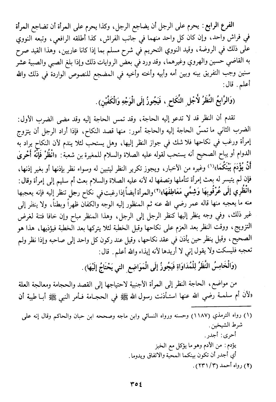 تقدم أَن النّظر قد لَا تَدْعُو إِلَيْهِ الْحَاجة وَقد تمس الْحَاجة إِلَيْهِ وَقد مضى الضَّرْب الأول الضَّرْب الثَّانِي مَا تمس الْحَاجة إِلَيْهِ وَالْحَاجة أُمُور مِنْهَا قصد النِّكَاح فَإِذا أَرَادَ الرجل أَن يتَزَوَّج امْرَأَة وَرغب فِي نِكَاحهَا فَلَا شكّ فِي جَوَاز النّظر إِلَيْهَا وَهل يسْتَحبّ لِئَلَّا ينْدَم لِأَن النِّكَاح يُرَاد بِهِ الدَّوَام أَو يُبَاح الصَّحِيح أَنه يسْتَحبّ لقَوْله عَلَيْهِ الصَّلَاة وَالسَّلَام للْمُغِيرَة بن شُعْبَة انْظُر فَإِنَّهُ أَحْرَى أَن يُؤْدم بَيْنكُمَا وَغَيره من الْأَخْبَار وَيجوز تَكْرِير النّظر ليتبين لَهُ وَسَوَاء نظر بِإِذْنِهَا أَو بِغَيْر إِذْنهَا فَإِن لم يَتَيَسَّر لَهُ بعث امْرَأَة تتأملها وتصفها لَهُ لِأَنَّهُ عَلَيْهِ الصَّلَاة وَالسَّلَام بعث أم سليم إِلَى امْرَأَة وَقَالَ انظري إِلَى عرقوبها وشمي معاطفها وَالْمَرْأَة أَيْضا إِذا رغبت فِي نِكَاح رجل تنظر إِلَيْهِ فَإِنَّهُ يعجبها مِنْهُ مَا يُعجبهُ مِنْهَا قَالَه عمر رَضِي الله عَنهُ ثمَّ المنظور إِلَيْهِ الْوَجْه والكفان ظهرا وبطناً وَلَا ينظر إِلَى غير ذَلِك وَفِي وَجه ينظر إِلَيْهَا كنظر الرجل إِلَى الرجل وَهَذَا المنظر مُبَاح وَإِن خافا فتْنَة لغَرَض التَّزْوِيج وَوقت النّظر بعد الْعَزْم على نِكَاحهَا وَقبل الْخطْبَة لِئَلَّا يَتْرُكهَا بعد الْخطْبَة فيؤذيها هَذَا هُوَ الصَّحِيح وَقيل ينظر حِين يَأْذَن فِي عقد نِكَاحهَا وَقيل عِنْد ركون كل وَاحِد إِلَى صَاحبه وَإِذا نظر وَلم تعجبه فليسكت وَلَا يَقُول إِنِّي لَا أريدها لِأَنَّهُ إِيذَاء وَالله أعلم قَالَ