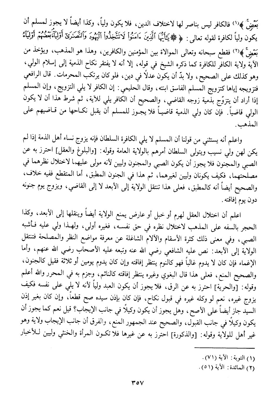 فالكافر لَيْسَ بناصر لَهَا لاخْتِلَاف الدّين فَلَا يكون وليا وَكَذَا أَيْضا لَا يجوز لمُسلم أَن يكون وليا لكافرة لقَوْله تَعَالَى {يَا أَيُّهَا الَّذِينَ آمَنُوا لَا تَتَّخِذُوا الْيَهُودَ وَالنَّصَارَى أَوْلِيَاءَ بَعْضُهُمْ أَوْلِيَاءُ بَعْضٍ} فَقطع سُبْحَانَهُ وَتَعَالَى الْمُوَالَاة بَين الْمُؤمنِينَ والكافرين وَهَذَا هُوَ الْمَذْهَب وَيُؤْخَذ من الْآيَة ولَايَة الْكَافِر للكافرة كَمَا ذكره الشَّيْخ فِي قَوْله إِلَّا أَنه لَا يفْتَقر نِكَاح الذِّمِّيَّة إِلَى إِسْلَام الْوَلِيّ وَهُوَ كَذَلِك على الصَّحِيح وَلَا بُد أَن يكون عدلا فِي دين فَلَو كَانَ يرتكب الْمُحرمَات قَالَ الرَّافِعِيّ فتزويجه إِيَّاهَا كتزويج الْمُسلم الْفَاسِق ابْنَته وَقَالَ الْحَلِيمِيّ إِن الْكَافِر لَا يَلِي التَّزْوِيج وَإِن الْمُسلم إِذا أَرَادَ أَن يتَزَوَّج بذمية زَوْجَة القَاضِي وَالصَّحِيح أَن الْكَافِر يَلِي لِلْآيَةِ ثمَّ شَرط هَذَا أَن لَا يكون الْوَلِيّ قَاضِيا فَإِن كَانَ ولي الذِّمِّيَّة قَاضِيا فَلَا يجوز للْمُسلمِ أَن يقبل نِكَاحهَا من قاضيهم على الْمَذْهَب