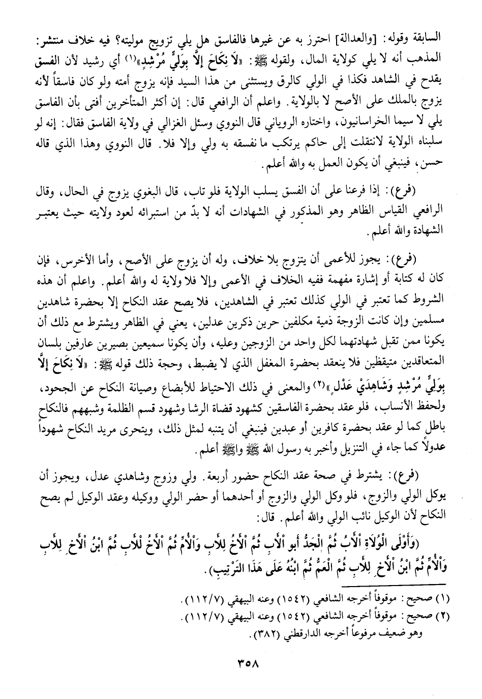 (فرع) يجوز للأعمى أَن يتَزَوَّج بِلَا خلاف وَله أَن يُزَوّج على الْأَصَح وَأما الْأَخْرَس فَإِن كَانَ لَهُ كِتَابَة أَو إِشَارَة مفهمة فَفِيهِ الْخلاف فِي الْأَعْمَى وَإِلَّا فَلَا ولَايَة لَهُ وَالله أعلم وَاعْلَم أَن هَذِه الشُّرُوط كَمَا تعْتَبر فِي الْوَلِيّ كَذَلِك تعْتَبر فِي الشَّاهِدين فَلَا يَصح عقد النِّكَاح إِلَّا بِحَضْرَة شَاهِدين مُسلمين وَإِن كَانَت الزَّوْجَة ذِمِّيَّة مكلفين حُرَّيْنِ ذكرين عَدْلَيْنِ يَعْنِي فِي الظَّاهِر وَيشْتَرط مَعَ ذَلِك أَن يَكُونَا مِمَّن تقبل شَهَادَتهمَا لكل وَاحِد من الزَّوْجَيْنِ وَعَلِيهِ وَأَن يَكُونَا سميعين بصيرين عارفين بِلِسَان الْمُتَعَاقدين متيقظين فَلَا ينْعَقد بِحَضْرَة الْمُغَفَّل الَّذِي لَا يضْبط وَحجَّة ذَلِك قَوْله صلى الله عَلَيْهِ وَسلم ((لَا نِكَاح إِلَّا بولِي مرشد وشاهدي عدل)) وَالْمعْنَى فِي ذَلِك الِاحْتِيَاط للأبضاع وصيانة النِّكَاح عَن الْجُحُود ولحفظ الْأَنْسَاب فَلَو عقد بِحَضْرَة الْفَاسِقين كشهود قُضَاة الرشا وشهود قسم الظلمَة وشبههم فَالنِّكَاح بَاطِل كَمَا لَو عقد بِحَضْرَة كَافِرين أَو عَبْدَيْنِ فَيَنْبَغِي أَن يتَنَبَّه لمثل ذَلِك ويتحرى مُرِيد النِّكَاح شُهُودًا عُدُولًا كَمَا جَاءَ فِي التَّنْزِيل وَأخْبر بِهِ رَسُول الله صلى الله عَلَيْهِ وَسلم وَالله أعلم