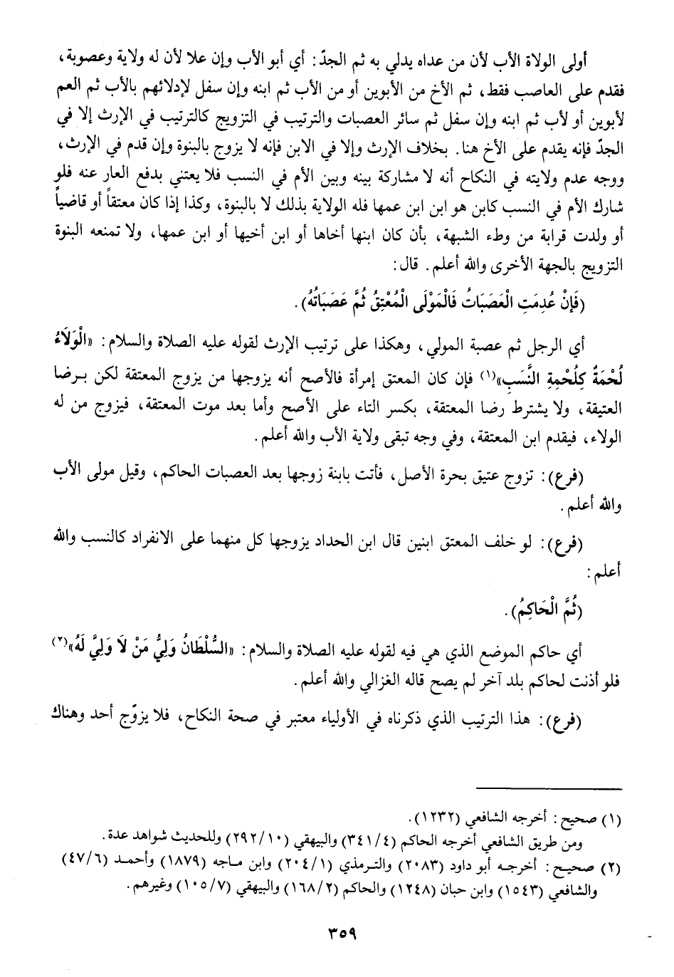 أَي الرجل ثمَّ عصبَة الْمولى وَهَكَذَا على تَرْتِيب الْإِرْث لقَوْله عَلَيْهِ الصَّلَاة وَالسَّلَام ((الْوَلَاء لحْمَة كلحمة النّسَب)) فَإِن كَانَ الْمُعْتق امْرَأَة فَالْأَصَحّ أَنه يُزَوّجهَا من يُزَوّج الْمُعتقَة لَكِن بِرِضا العتيقة وَلَا يشْتَرط رضَا الْمُعتقَة بِكَسْر التَّاء على الْأَصَح وَأما بعد موت الْمُعتقَة فيزوج من لَهُ الْوَلَاء فَيقدم ابْن الْمُعتقَة وَفِي وَجه تبقى ولَايَة الْأَب وَالله أعلم