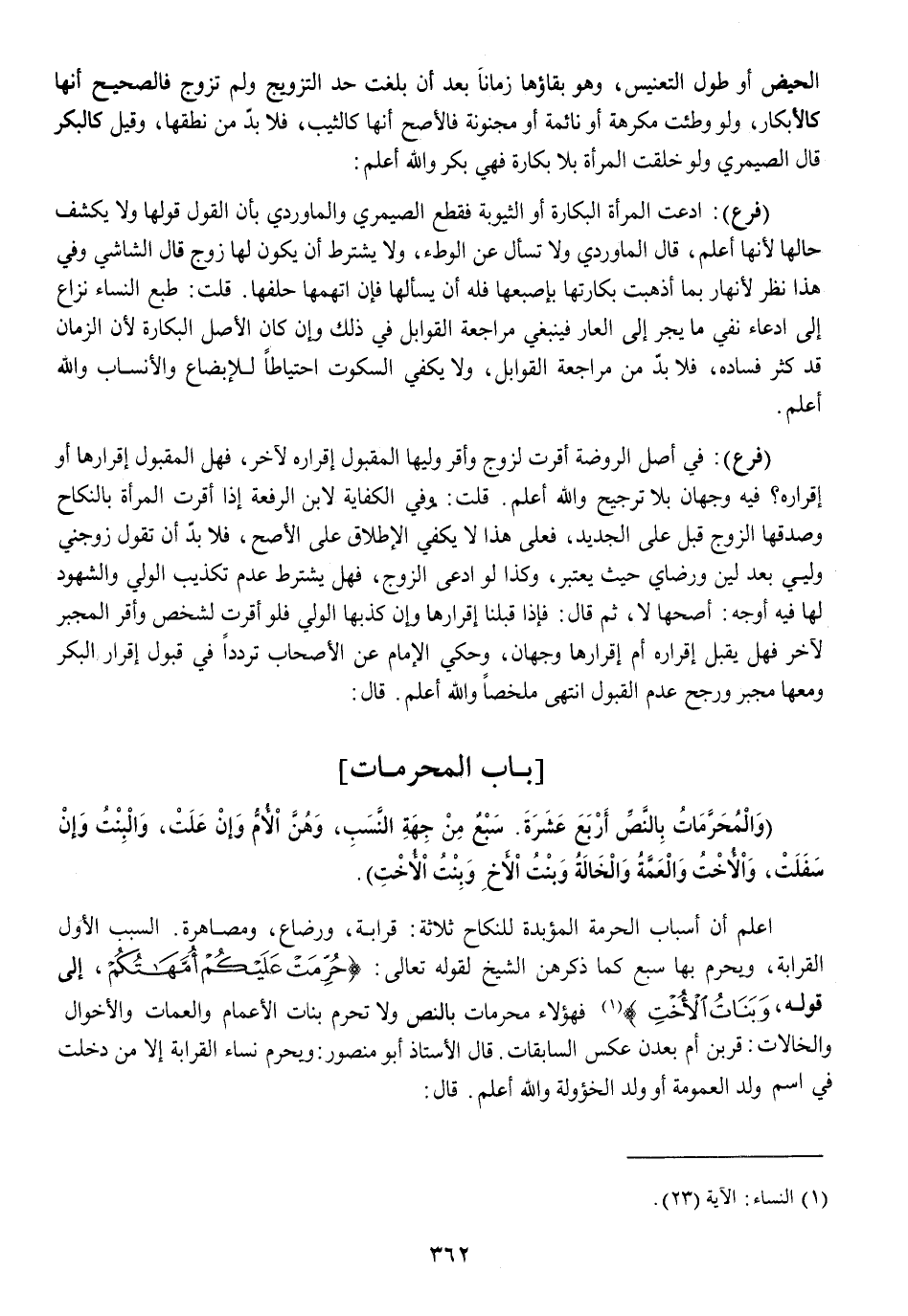اعْلَم أَن أَسبَاب الْحُرْمَة المؤبدة للنِّكَاح ثَلَاث قرَابَة ورضاع ومصاهرة السَّبَب الأول الْقَرَابَة وَيحرم بهَا سبع كَمَا ذكرهن الشَّيْخ لقَوْله تَعَالَى {حُرِّمَتْ عَلَيْكُمْ أُمَّهَاتُكُمْ} إِلَى قَوْله {وَبَنَاتُ الْأُخْتِ} فَهَؤُلَاءِ مُحرمَات بِالنَّصِّ وَلَا تحرم بَنَات الْأَعْمَام والعمات والأخوال والخالات قربن أم بعدن عكس السابقات قَالَ الْأُسْتَاذ أَبُو مَنْصُور وَيحرم نسَاء الْقَرَابَة إِلَّا من دخلت فِي اسْم ولد العمومة أَو ولد الخؤولة وَالله أعلم قَالَ