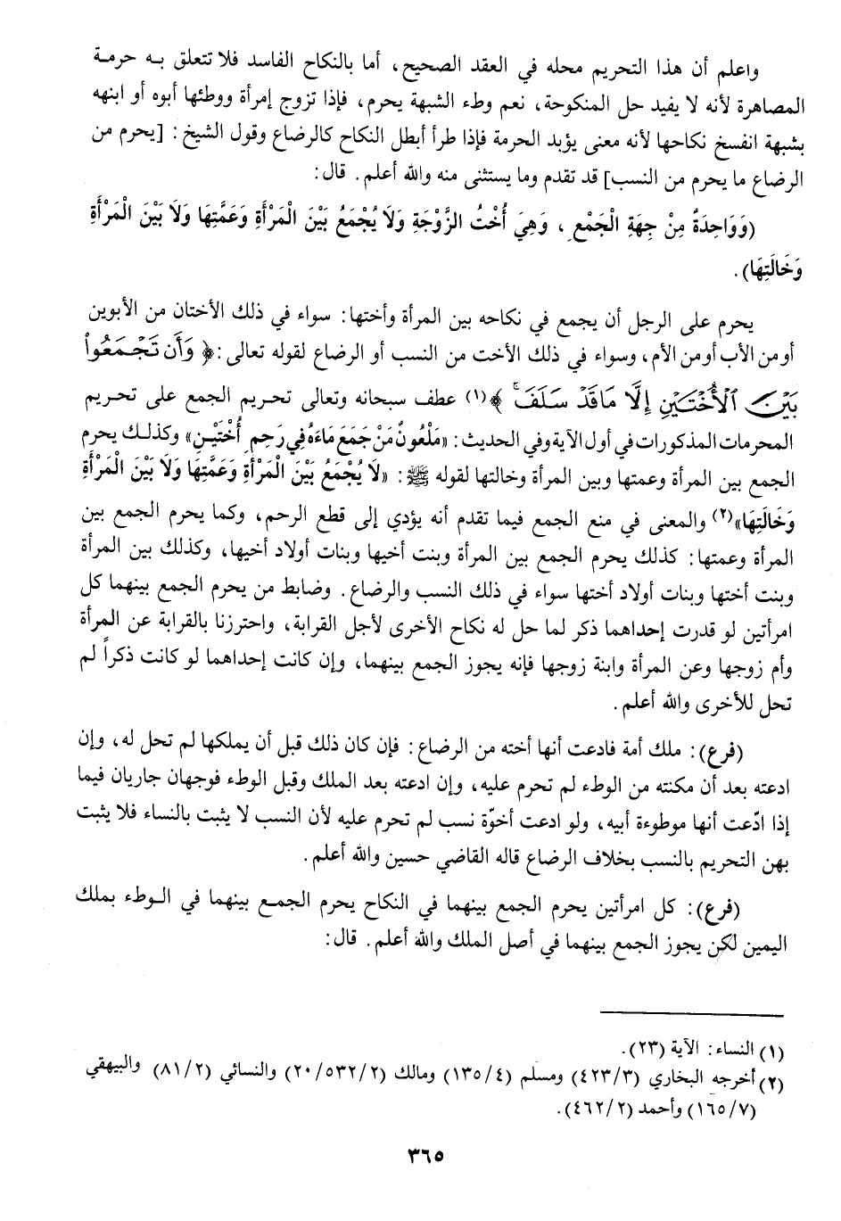 يحرم على الرجل أَن يجمع فِي نِكَاح بَين الْمَرْأَة وَأُخْتهَا سَوَاء فِي ذَلِك الْأخْتَان من الْأَبَوَيْنِ أَو من الْأَب أَو من الْأُم وَسَوَاء فِي ذَلِك الْأُخْت من النّسَب أَو لرضاع لقَوْله تَعَالَى {وَأَنْ تَجْمَعُوا بَيْنَ الْأُخْتَيْنِ إِلَّا مَا قَدْ سَلَفَ} عطف سُبْحَانَهُ وَتَعَالَى تَحْرِيم الْجمع على تَحْرِيم الْمُحرمَات الْمَذْكُورَات فِي أول الْآيَة وَفِي الحَدِيث مَلْعُون من جمع مَاءَهُ فِي رحم الْأُخْتَيْنِ وَكَذَلِكَ يحرم الْجمع بَين الْمَرْأَة وعمتها وَبَين الْمَرْأَة وخالتها لقَوْله صلى الله عَلَيْهِ وَسلم ((لَا يجمع بَين الْمَرْأَة وعمتها وَلَا بَين الْمَرْأَة وخالتها)) وَالْمعْنَى فِي منع الْجمع فِيمَا تقدم أَنه يُؤَدِّي إِلَى قطع الرَّحِم وكما يحرم الْجمع بَين الْمَرْأَة وعمتها كَذَلِك يحرم الْجمع بَين الْمَرْأَة وَبنت أَخِيهَا وَبَنَات أَوْلَاد أَخِيهَا وَكَذَلِكَ بَين الْمَرْأَة وَبنت أُخْتهَا وَبَنَات أَوْلَاد أُخْتهَا سَوَاء فِي ذَلِك النّسَب وَالرّضَاع وَضَابِط من يحرم الْجمع بَينهمَا كل امْرَأتَيْنِ لَو قدرت إِحْدَاهمَا ذكر لما حل لَهُ نِكَاح الْأُخْرَى لأجل الْقَرَابَة واحترزنا بِالْقَرَابَةِ عَن الْمَرْأَة وَأم زَوجهَا وَعَن الْمَرْأَة وَابْنَة زَوجهَا فَإِنَّهُ يجوز الْجمع بَينهمَا وَإِن كَانَت إِحْدَاهمَا لَو كَانَت ذكرا لم تحل لِلْأُخْرَى وَالله أعلم