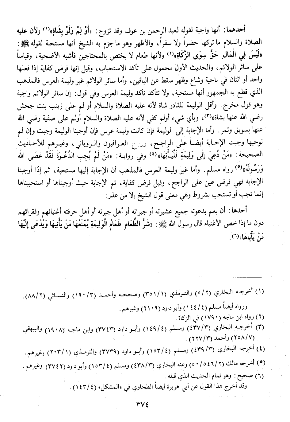 أَحدهمَا أَنَّهَا وَاجِبَة لقَوْله لعبد الرَّحْمَن بن عَوْف وَقد تزوج أولم وَلَو بِشَاة وَلِأَن عَلَيْهِ الصَّلَاة وَالسَّلَام مَا تَركهَا حضرا وَلَا سفرا وَالْأَظْهَر وَهُوَ مَا جزم بِهِ الشَّيْخ أَنَّهَا مُسْتَحبَّة لقَوْله صلى الله عَلَيْهِ وَسلم لَيْسَ فِي المَال حق سوى الزَّكَاة وَلِأَنَّهَا طَعَام لَا يخْتَص بالمحتاجين فَأشبه الْأُضْحِية وَقِيَاسًا على سَائِر الولائم والْحَدِيث الأول مَحْمُول على تَأَكد الِاسْتِحْبَاب وَقيل إِنَّهَا فرض كِفَايَة إِذا فعلهَا وَاحِد اَوْ اثْنَان فِي نَاحيَة وشاع وَظهر سقط عَن البَاقِينَ وَأما سَائِر الولائم غير وَلِيمَة الْعرس فَالْمَذْهَب الَّذِي قطع بِهِ الْجُمْهُور أَنَّهَا مُسْتَحبَّة وَلَا تتأكد تَأَكد وَلِيمَة الْعرس وَفِي قَول إِن سَائِر الولائم وَاجِبَة وَهُوَ قَول مخرج وَأَقل الْوَلِيمَة للقادر شَاة لِأَنَّهُ عَلَيْهِ الصَّلَاة وَالسَّلَام أَو لم على زَيْنَب بنت جحش رَضِي الله عَنْهَا بِشَاة وَبِأَيِّ شَيْء أولم كفى لِأَنَّهُ عَلَيْهِ الصَّلَاة وَالسَّلَام أولم على صَفِيَّة رَضِي الله عَنْهَا بسويق وتمر وَأما الْإِجَابَة إِلَى الْوَلِيمَة فَإِن كَانَت وَلِيمَة عرس فَإِن أَوجَبْنَا الْوَلِيمَة وَجَبت وَإِن لم نوجبها وَجَبت الْإِجَابَة على الرَّاجِح وَرجح الْعِرَاقِيُّونَ وَالرُّويَانِيّ وَغَيرهم للأحاديث الصَّحِيحَة من دعِي إِلَى وَلِيمَة فليأتها وَفِي رِوَايَة من لم يجب الدعْوَة فقد عصى الله وَرَسُوله رَوَاهُ مُسلم وَأما غير وَلِيمَة الْعرس فَالْمَذْهَب أَن الْإِجَابَة إِلَيْهَا مُسْتَحبَّة ثمَّ إِذا أَوجَبْنَا الْإِجَابَة فَهِيَ فرض عين على الرَّاجِح وَقيل فرض كِفَايَة ثمَّ الْإِجَابَة حَيْثُ أوجبناها أَو استحببناها إِنَّمَا تجب أَو تسْتَحب بِشُرُوط وَهِي معنى قَول الشَّيْخ إِلَّا من عذر
