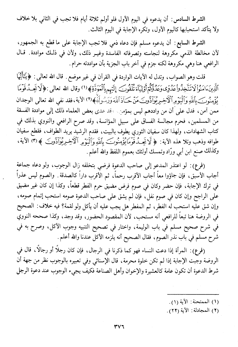 الشَّرْط السَّابِع أَن يَدعُوهُ مُسلم فَإِن دَعَاهُ ذمِّي فَلَا تجب الْإِجَابَة على مَا قطع بِهِ الْجُمْهُور لِأَن مُخَالطَة الذِّمِّيّ مَكْرُوهَة لنجاسته وتصرفاته الْفَاسِدَة وَغير ذَلِك وَلِأَن فِي ذَلِك مواددة قَالَ الرَّافِعِيّ هُنَا وَهِي مَكْرُوهَة لكنه جزم فِي آخر بَاب الْجِزْيَة بِأَن مواددته حرَام