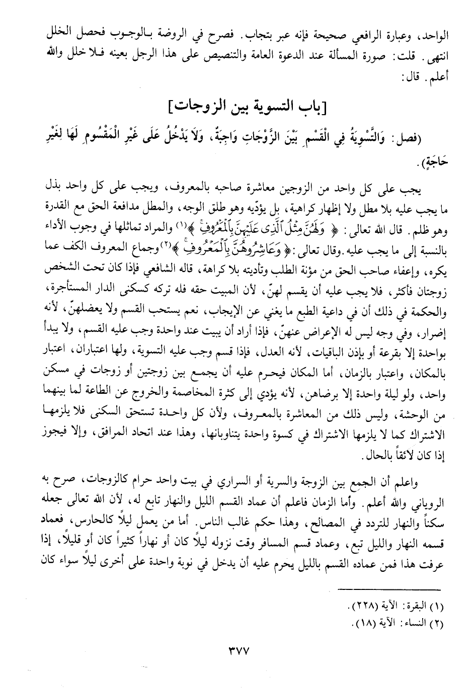 يجب على كل وَاحِد من الزَّوْجَيْنِ معاشرة صَاحبه بِالْمَعْرُوفِ وَيجب على كل وَاحِد بذل مَا يجب عَلَيْهِ بِلَا مطل وَلَا إِظْهَار كَرَاهِيَة بل يُؤَدِّيه وَهُوَ طلق الْوَجْه والمطل مدافعة الْحق مَعَ الْقُدْرَة وَهُوَ ظلم قَالَ الله تَعَالَى {وَلَهُنَّ مِثْلُ الَّذِي عَلَيْهِنَّ بِالْمَعْرُوفِ} وَالْمرَاد تماثلها فِي وجوب الْأَدَاء بِالنِّسْبَةِ إِلَى مَا يجب عَلَيْهِ وَقَالَ تَعَالَى {وَعَاشِرُوهُنَّ بِالْمَعْرُوفِ} وجماع الْمَعْرُوف الْكَفّ عَمَّا يكره وإعفاء صَاحب الْحق من مُؤنَة الطّلب وتأديته بِلَا كَرَاهَة قَالَه الشَّافِعِي فَإِذا كَانَ تَحت الشَّخْص زوجتان فَأكْثر فَلَا يجب عَلَيْهِ أَن يقسم لَهُنَّ لِأَن الْمبيت حَقه فَلهُ تَركه كسكنى الدَّار الْمُسْتَأْجرَة وَالْحكمَة فِي ذَلِك أَن فِي دَاعِيَة الطَّبْع مَا يُغني عَن الْإِيجَاب نعم يسْتَحبّ الْقسم وَلَا يعضلهن لِأَنَّهُ إِضْرَار وَفِي وَجه لَيْسَ لَهُ الْإِعْرَاض عَنْهُن فَإِذا أَرَادَ أَن يبيت عِنْد وَاحِدَة وَجب عَلَيْهِ الْقسم وَلَا يبْدَأ بِوَاحِدَة إِلَّا بِقرْعَة أَو بِإِذن الْبَاقِيَات لِأَنَّهُ الْعدْل فَإِذا قسم وَجب عَلَيْهِ التَّسْوِيَة وَلها اعتباران اعْتِبَار بِالْمَكَانِ وَاعْتِبَار بِالزَّمَانِ أما الْمَكَان فَيحرم عَلَيْهِ أَن يجمع بَين زَوْجَتَيْنِ أَو زَوْجَات فِي مسكن وَاحِد وَلَو لَيْلَة وَاحِدَة إِلَّا برضاهن لِأَنَّهُ يُؤَدِّي إِلَى كَثْرَة الْمُخَاصمَة وَالْخُرُوج عَن الطَّاعَة لما بَينهمَا من الوحشة وَلَيْسَ ذَلِك من المعاشرة بِالْمَعْرُوفِ وَلِأَن كل وَاحِدَة تسْتَحقّ السُّكْنَى فَلَا يلْزمهَا الِاشْتِرَاك كَمَا لَا يلْزمهَا الِاشْتِرَاك فِي كسْوَة وَاحِدَة يتناوبانها وَهَذَا عِنْد اتِّحَاد الْمرَافِق وَإِلَّا فَيجوز إِذا كَانَ لائقاً بِالْحَال