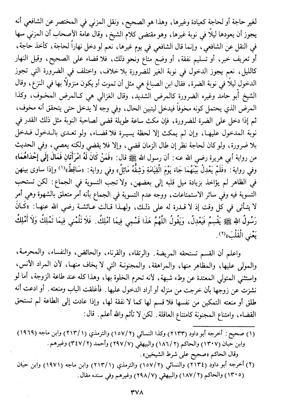 رِوَايَة أبي هُرَيْرَة رَضِي الله عَنهُ أَن رَسُول الله صلى الله عَلَيْهِ وَسلم قَالَ فَمن كَانَ لَهُ امْرَأَتَانِ فَمَال إِلَى إِحْدَاهمَا وَفِي رِوَايَة فَلم يعدل بَينهمَا جَاءَ يَوْم الْقِيَامَة وشقة مائل وَفِي رِوَايَة سَاقِط وَإِذا سَاوَى بَينهُنَّ فِي الظَّاهِر لم يُؤَاخذ بِزِيَادَة ميل قلبه إِلَى بَعضهنَّ وَلَا تجب التَّسْوِيَة فِي الْجِمَاع لَكِن تسْتَحب التَّسْوِيَة فِيهِ وَفِي سَائِر الاستمتاعات وَوجه عدم التَّسْوِيَة فِي الْجِمَاع بِأَنَّهُ أَمر مُتَعَلق بالشهوة وَهِي أَمر لَا يَتَأَتَّى فِي كل وَقت إِذْ لَا قدرَة لَهُ على ذَلِك وَلِهَذَا قَالَت عَائِشَة رَضِي الله عَنْهَا كَانَ رَسُول الله صلى الله عَلَيْهِ وَسلم يقسم فيعدل وَيَقُول اللَّهُمَّ هَذَا قسمي فِيمَا أملك فَلَا تلمني فِيمَا تملك وَلَا أملك يَعْنِي الْقلب