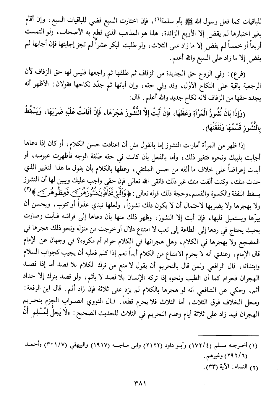 إِذا ظهر من الْمَرْأَة أَمَارَات النُّشُوز إِمَّا بالْقَوْل مثل إِن اعتادت حسن الْكَلَام أَو كَانَ إِذا دَعَاهَا أجابت بلبيك وَنَحْوه فَتغير ذَلِك وَإِمَّا بِالْفِعْلِ بِأَن كَانَت فِي حَقه طَلْقَة الْوَجْه فأظهرت عبوسة أَو أبدت إعْرَاضًا على خلاف مَا أَلفه من حسن الْمُلْتَقى وعظها بالْكلَام بِأَن يَقُول مَا هَذَا التَّغْيِير الَّذِي حدث مِنْك وَكنت ألفت مِنْك غير ذَلِك فاتقي الله فَإِن حَقي وَاجِب عَلَيْك وَيبين لَهَا أَن النُّشُوز يسْقط النَّفَقَة وَالْكِسْوَة وَالْقسم وَحجَّة ذَلِك قَوْله تَعَالَى {واللاتي تخافون نشوزهن فعظوهن} وَلَا يهجرها وَلَا يضْربهَا لاحْتِمَال أَن لَا يكون ذَلِك نُشُوزًا ولعلها تبدي عذرا أَو تتوب وَيحسن أَن يبرها ويستميل قَلبهَا فَإِن أَبَت إِلَّا النُّشُوز وَظهر ذَلِك مِنْهَا بِأَن دَعَاهَا إِلَى فرَاشه فَأَبت وَصَارَت بِحَيْثُ يحْتَاج فِي ردهَا إِلَى الطَّاعَة إِلَى تَعب لَا امْتنَاع دلال أَو خرجت من منزله وَنَحْو ذَلِك هجرها فِي المضجع وَلَا يهجرها فِي الْكَلَام وَهل هجرانها فِي الْكَلَام حرَام أم مَكْرُوه فِي وَجْهَان عَن الإِمَام قَالَ الإِمَام وَعِنْدِي أَنه لَا يحرم الِامْتِنَاع من الْكَلَام أبدا نعم إِذا كلم فَعَلَيهِ أَن يُجيب كجواب السَّلَام وابتدائه قَالَ الرَّافِعِيّ وَلمن قَالَ بِالتَّحْرِيمِ أَن يَقُول لَا منع من ترك الْكَلَام بِلَا قصد أما إِذا قصد الهجران فَحَرَام كَمَا أَن الطّيب وَنَحْوه إِذا تَركه الْإِنْسَان بِلَا قصد لَا يَأْثَم وَلَو قصد بترك إِلَّا حداد أَثم وَحكى عَن الشَّافِعِي أَنه لَو هجرها بالْكلَام لم يزدْ على ثَلَاثَة فَإِن زَاد أَثم قَالَ ابْن الرّفْعَة وَمحل الْخلاف فَوق الثَّلَاث أما الثَّلَاث فَلَا يحرم قطعا قَالَ النَّوَوِيّ الصَّوَاب الْجَزْم بِتَحْرِيم الهجران فِيمَا زَاد على ثَلَاثَة أَيَّام وَعدم التَّحْرِيم فِي الثَّلَاث للْحَدِيث الصَّحِيح لَا يحل لمُسلم أَن