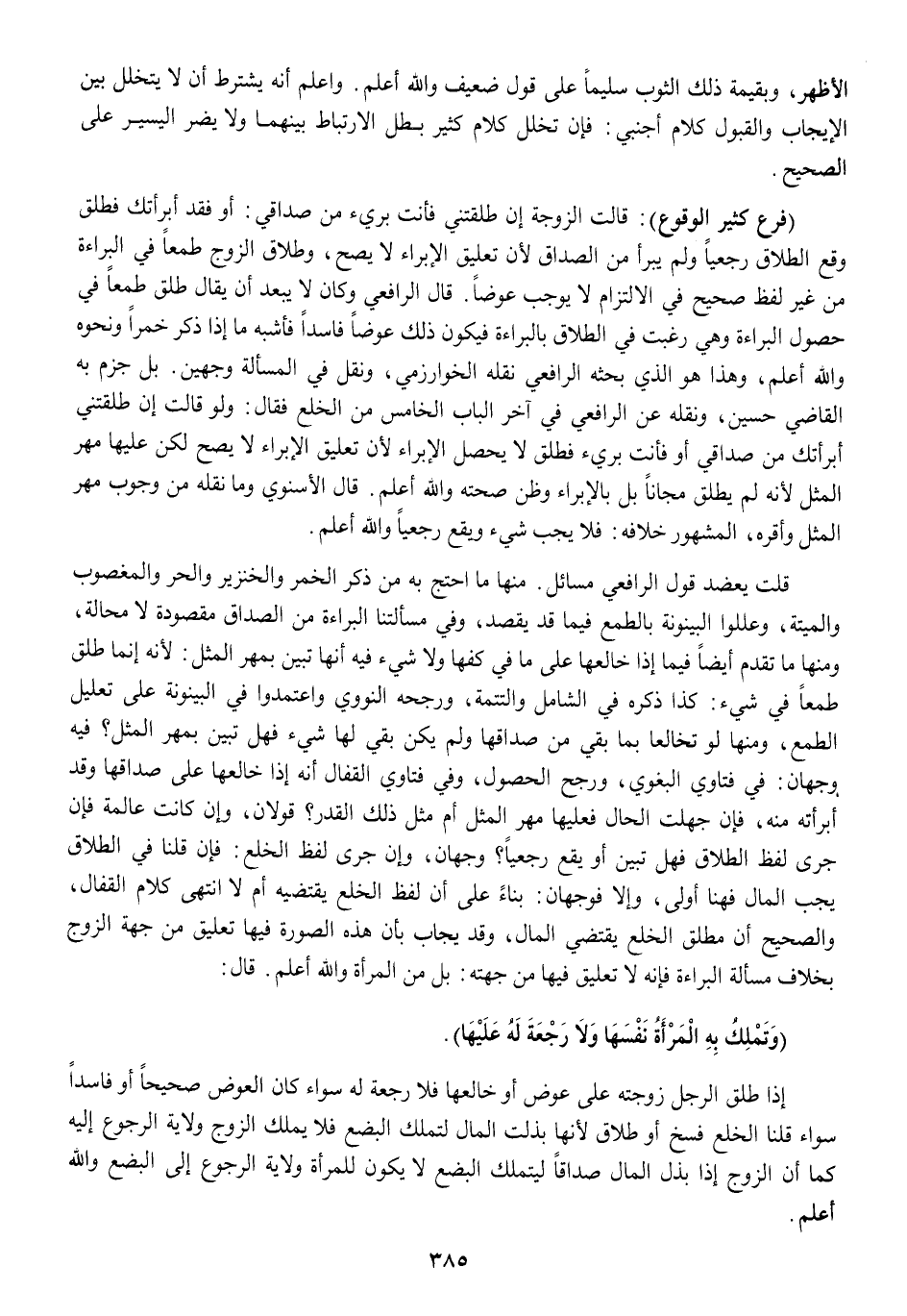 (فرع كثير الْوُقُوع) قَالَت الزَّوْجَة إِن طلقتني فَأَنت بَرِيء من صَدَاقي أَو فقد أَبْرَأتك فَطلق وَقع الطَّلَاق رَجْعِيًا وَلم يبرأ من الصَدَاق لِأَن تَعْلِيق الأبراء لَا يَصح وَطَلَاق الزَّوْج طَمَعا فِي الْبَرَاءَة من غير لفظ صَحِيح فِي الِالْتِزَام لَا يُوجب عوضا قَالَ الرَّافِعِيّ وَكَانَ لَا يبعد أَن يُقَال طلق طَمَعا فِي حُصُول الْبَرَاءَة وَهِي رغبت فِي الطَّلَاق بِالْبَرَاءَةِ فَيكون ذَلِك عوضا فَاسِدا فَأشبه مَا إِذا ذكر خمرًا وَنَحْوه وَالله أعلم وَهَذَا هُوَ الَّذِي بَحثه الرَّافِعِيّ نَقله الْخَوَارِزْمِيّ وَنقل فِي الْمَسْأَلَة وَجْهَيْن بل جزم بِهِ القَاضِي حُسَيْن وَنَقله عَن الرَّافِعِيّ فِي آخر الْبَاب الْخَامِس من الْخلْع فَقَالَ وَلَو قَالَت إِن طلقتني أَبْرَأتك من صَدَاقي أَو فَأَنت بَرِيء فَطلق لَا يحصل الْإِبْرَاء لِأَن تَعْلِيق الْإِبْرَاء لَا يَصح لَكِن عَلَيْهَا مهر الْمثل لِأَنَّهُ لم يُطلق مجَّانا بل بِالْإِبْرَاءِ وَظن صِحَّته وَالله أعلم قَالَ الأسنوي وَمَا نَقله من وجوب مهر الْمثل وأقرا الْمَشْهُور خِلَافه فَلَا يجب شَيْء وَيَقَع رَجْعِيًا وَالله أعلم