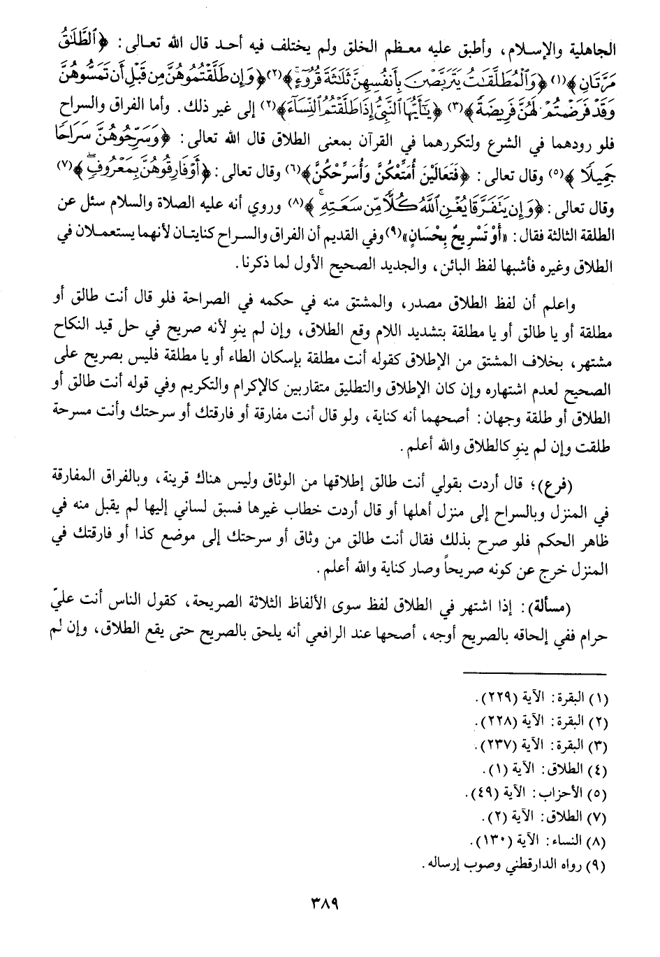 الْجَاهِلِيَّة وَالْإِسْلَام وأطبق عَلَيْهِ مُعظم الْخلق وَلم يخْتَلف فِيهِ أحد قَالَ الله تَعَالَى {الطَّلاقُ مَرَّتَانِ} {وَالْمُطَلَّقَاتُ يَتَرَبَّصْنَ بِأَنْفُسِهِنَّ ثَلاثَةَ قُرُوءٍ} {وَإِنْ طَلَّقْتُمُوهُنَّ مِنْ قَبْلِ أَنْ تَمَسُّوهُنَّ وَقَدْ فَرَضْتُمْ لَهُنَّ فَرِيضَةً} {يَا أَيُّهَا النَّبِيُّ إِذَا طَلَّقْتُمُ النِّسَاءَ} إِلَى غير ذَلِك وَأما الْفِرَاق والسراح فلورودهما فِي الشَّرْع ولتكرارهما فِي الْقُرْآن بِمَعْنى الطَّلَاق قَالَ الله تَعَالَى {وَسَرِّحُوهُنَّ سَرَاحاً جَمِيلاً} وَقَالَ تَعَالَى {فَتَعَالَيْنَ أُمَتِّعْكُنَّ وَأُسَرِّحْكُنَّ} وَقَالَ تَعَالَى {أَوْ فَارِقُوهُنَّ بِمَعْرُوفٍ} وَقَالَ تَعَالَى {وَإِنْ يَتَفَرَّقَا يُغْنِ اللَّهُ كُلّاً مِنْ سَعَتِهِ} وَرُوِيَ أَنه عَلَيْهِ الصَّلَاة وَالسَّلَام سُئِلَ عَن الطَّلقَة الثَّالِثَة فَقَالَ أَو تَسْرِيح بِإِحْسَان وَفِي الْقَدِيم أَن الْفِرَاق والسراح كنايتان لِأَنَّهُمَا يستعملان فِي الطَّلَاق وَغَيره فأشبها لفظ الْبَائِن والجديد الصَّحِيح الأول لما ذكرنَا