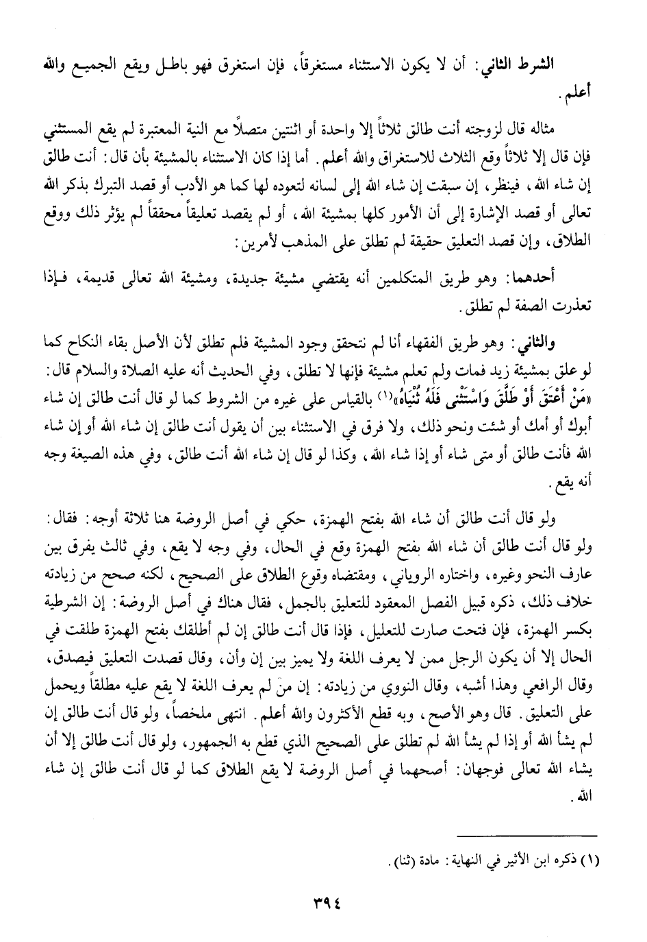 وَالثَّانِي وَهُوَ طَرِيق الْفُقَهَاء أَنا لم نتحقق وجود الْمَشِيئَة فَلم تطلق لِأَن الأَصْل بَقَاء النِّكَاح كَمَا لَو علق بِمَشِيئَة زيد فَمَاتَ وَلم تعلم مَشِيئَة فَإِنَّهَا لَا تطلق وَفِي الحَدِيث أَنه عَلَيْهِ الصَّلَاة وَالسَّلَام قَالَ من أعتق أَو طلق وَاسْتثنى فَلهُ ثنياه بِالْقِيَاسِ على غَيره من الشُّرُوط كَمَا لَو قَالَ أَنْت طَالِق إِن شَاءَ أَبوك أَو أمك أَو شِئْت وَنَحْو ذَلِك وَلَا فرق فِي الِاسْتِثْنَاء بَين أَن يَقُول أَنْت طَالِق إِن شَاءَ الله أَو إِن شَاءَ الله فَأَنت طَالِق أَو مَتى شَاءَ الله أَو إِذا شَاءَ الله وَكَذَا لَو قَالَ إِن شَاءَ الله أَنْت طَالِق وَفِي هَذِه الصِّيغَة وَجه أَن يَقع