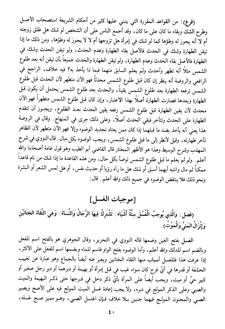 (فرع) من الْقَوَاعِد المقررة الَّتِي يَنْبَنِي عَلَيْهَا كثير من أَحْكَام الشَّرِيعَة اسْتِصْحَاب الأَصْل وَطرح الشَّك وَبَقَاء مَا كَانَ على مَا كَانَ وَقد أجمع النَّاس على أَن الشَّخْص لَو شكّ هَل طلق زوجنه أم لَا أَنه يجوز لَهُ وَطْؤُهَا كَمَا لَو شكّ فِي امْرَأَة هَل تزَوجهَا أم لَا لَا يجوز لَهُ وَطْؤُهَا وَمن ذَلِك مَا إِذا تَيَقّن الطَّهَارَة وَشك فِي الْحَدث فَالْأَصْل بَقَاء الطَّهَارَة وَعدم الْحَدث وَلَو تَيَقّن الْحَدث وَشك فِي الطَّهَارَة فَالْأَصْل بَقَاء الْحَدث وَعدم الطَّهَارَة وَلَو تَيَقّن الطَّهَارَة وَالْحَدَث جَمِيعًا بِأَن تَيَقّن أَنه بعد طُلُوع الشَّمْس مثلا أَنه تطهر وأحدث وَلم يعلم السَّابِق مِنْهُمَا فبماذا يَأْخُذ بِهِ فِيهِ خلاف الرَّاجِح فِي الرَّافِعِيّ وَالرَّوْضَة أَنه ينظر إِن كَانَ قبل طُلُوع الشَّمْس يَقِينا وَالْحَدَث بعد طُلُوع الشَّمْس يحْتَمل أَن يكون قبل الطَّهَارَة وَبعدهَا فَصَارَت الطَّهَارَة أصلا بِهَذَا الِاعْتِبَار وَإِن كَانَ قبل طُلُوع الشَّمْس متطهراً فَهُوَ الْآن مُحدث لِأَن يَقِين الطَّهَارَة قبل طُلُوع الشَّمْس رَفعه يَقِين الْحَدث بعد الطُّلُوع وَيجوز أَن تتقدم الطَّهَارَة على الْحَدث وتتأخر فَبَقيَ الْحَدث أصلا وعَلى ذَلِك جرى فِي الْمِنْهَاج وَقَالَ فِي الرَّوْضَة هَذَا يَعْنِي أَنه يَأْخُذ بضد مَا قبلهمَا إِذا كَانَ مِمَّن يعْتَاد تَجْدِيد الْوضُوء وَإِلَّا فَهُوَ الْآن متطهر لِأَن الظَّاهِر تَأَخّر طهارنه وَقيل لانظر إِلَى مَا قبل طُلُوع الشَّمْس وَيجب الْوضُوء بِكُل حَال قَالَ النَّوَوِيّ فِي شرح الْمُهَذّب وَشرح الْوَسِيط وَهَذَا هُوَ الْأَظْهر الْمُخْتَار قَالَ القَاضِي أَبُو الطّيب وَهُوَ قَول عَامَّة أَصْحَابنَا وَالله أعلم وَلَو لم يعلم مَا قبل طُلُوع الشَّمْس تَوَضَّأ بِكُل حَال وَمن هَذِه الْقَاعِدَة مَا إِذا شكّ من نَام قَاعِدا مُمكنا ثمَّ مَال وانتبه أَيهمَا أسبق أَو شكّ هَل مَا رَآهُ رُؤْيا أَو حَدِيث نفس أَو هَل لمس الشّعْر أَو الْبشرَة وَنَحْو ذَلِك فَلَا ينْتَقض الْوضُوء فِي جَمِيع ذَلِك وَالله أعلم قَالَ