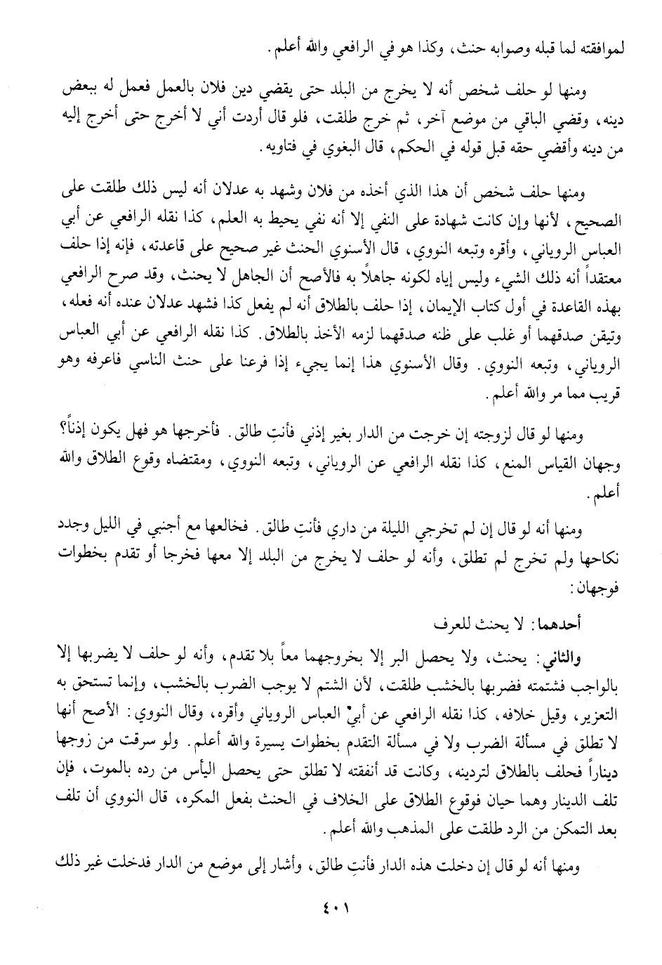وَمِنْهَا لَو قَالَ لزوجته إِن خرجت من الدَّار بِغَيْر إذني فَأَنت طَالِق فأخرجها هُوَ فَهَل يكون إِذْنا وَجْهَان الْقيَاس الْمَنْع كَذَا نَقله الرَّافِعِيّ عَن الرَّوْيَانِيّ وَتَبعهُ النَّوَوِيّ وَمُقْتَضَاهُ وُقُوع الطَّلَاق وَالله أعلم