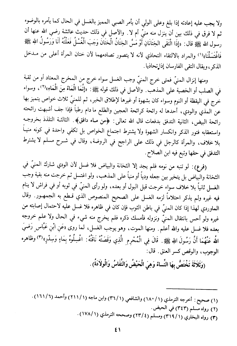 (إِنَّمَا المَاء من المَاء) وَسَوَاء خرج فِي الْيَقَظَة أَو النّوم وَسَوَاء كَانَ بِشَهْوَة أَو غَيرهَا لإِطْلَاق الْخَبَر ثمَّ للمني ثَلَاث خَواص يتَمَيَّز بهَا عَن الْمَذْي والودي أَحدهَا لَهُ رَائِحَة كرائحة الْعَجِين والطلع مَا دَامَ رطبا فإذاجف أشبهت رائحتة رَائِحَة الْبيض الثَّانِيَة التدفق دفعات قَالَ الله تَعَالَى {من مَاء دافق} الثَّالِثَة التَّلَذُّذ بِخُرُوجِهِ واستعقابه فتور الذّكر وانكسار الشَّهْوَة وَلَا يشْتَرط اجْتِمَاع الْخَواص بل تَكْفِي وَاحِدَة فِي كَونه منياً بِلَا خلاف وَالْمَرْأَة كَالرّجلِ فِي ذَلِك على الرَّاجِح وَالرَّوْضَة وَقَالَ فِي شرح مُسلم لَا يشْتَرط التدفق فِي حَقّهَا وَتبع فِيهِ ابْن الصّلاح