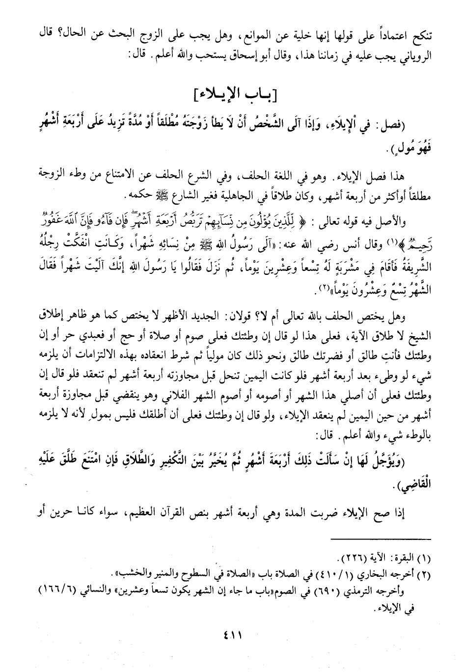 هَذَا فصل الْإِيلَاء وَهُوَ فِي اللُّغَة الْحلف وَفِي الشَّرْع الْحلف عَن الِامْتِنَاع من وَطْء الزَّوْجَة مُطلقًا أَو أَكثر من أَرْبَعَة أشهر وَكَانَ طَلَاقا فِي الْجَاهِلِيَّة فَغير الشَّارِع صلى الله عَلَيْهِ وَسلم حكمه