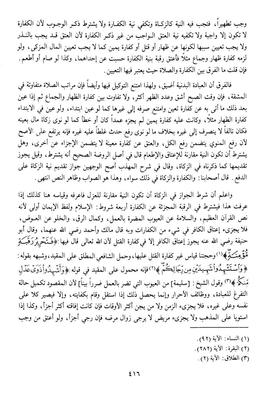 وَاعْلَم أَن شَرط الْجَوَاز فِي الزَّكَاة أَن تكون النِّيَّة مُقَارنَة للعزل فاعرفه وَقِيَاسه هُنَا كَذَلِك إِذا عرفت هَذَا فَيشْتَرط فِي الرَّقَبَة المجزئة عَن الْكَفَّارَة أَرْبَعَة شُرُوط الْإِسْلَام وَلَفظ الْإِيمَان أولى لِأَنَّهُ نَص الْقُرْآن الْعَظِيم والسلامة عَن الْعُيُوب الْمضرَّة بِالْعَمَلِ وَكَمَال الرّقّ والخلو عَن الْعِوَض فَلَا يُجزئ إِعْتَاق الْكَافِر فِي شَيْء من الْكَفَّارَات وَبِه قَالَ مَالك وَأحمد رَضِي الله عَنْهُمَا وَقَالَ أَبُو حنيفَة رَضِي الله عَنهُ يجوز إِعْتَاق الْكَافِر إِلَّا فِي كَفَّارَة الْقَتْل لِأَن الله تَعَالَى قَالَ فِيهَا {فَتَحْرِيرُ رَقَبَةٍ مُؤْمِنَةٍ} وَحجَّتنَا قِيَاس غير كَفَّارَة الْقَتْل عَلَيْهَا وَحمل الشَّافِعِي الْمُطلق على الْمُقَيد وَشبهه بقوله {وَاسْتَشْهِدُوا شَهِيدَيْنِ مِنْ رِجَالِكُمْ} فَإِنَّهُ مَحْمُول على الْمُقَيد فِي قَوْله {وَأَشْهِدُوا ذَوَيْ عَدْلٍ مِنْكُمْ} وَقَول الشَّيْخ سليمَة من الْعُيُوب الَّتِي تضر بِالْعَمَلِ ضَرَرا بَينا لِأَن الْمَقْصُود تَكْمِيل حَالَة التفرغ لِلْعِبَادَةِ ووظائف الْأَحْرَار وَإِنَّمَا يحصل ذَلِك إِذا اسْتَقل وَقَامَ بكفايته وَإِلَّا فَيصير كلا على نَفسه وعَلى غَيره فَلَا يُجزئ الزَّمن وَلَا من يجن أَكثر الْأَوْقَات فَإِن كَانَت إِفَاقَته أَكثر أَجْزَأَ وَكَذَا إِذا اسْتَويَا على الْمَذْهَب وَلَا يُجزئ مَرِيض لَا يُرْجَى زَوَال مَرضه فَإِن رجى أَجْزَأَ وَلَو أعتق من وَجب