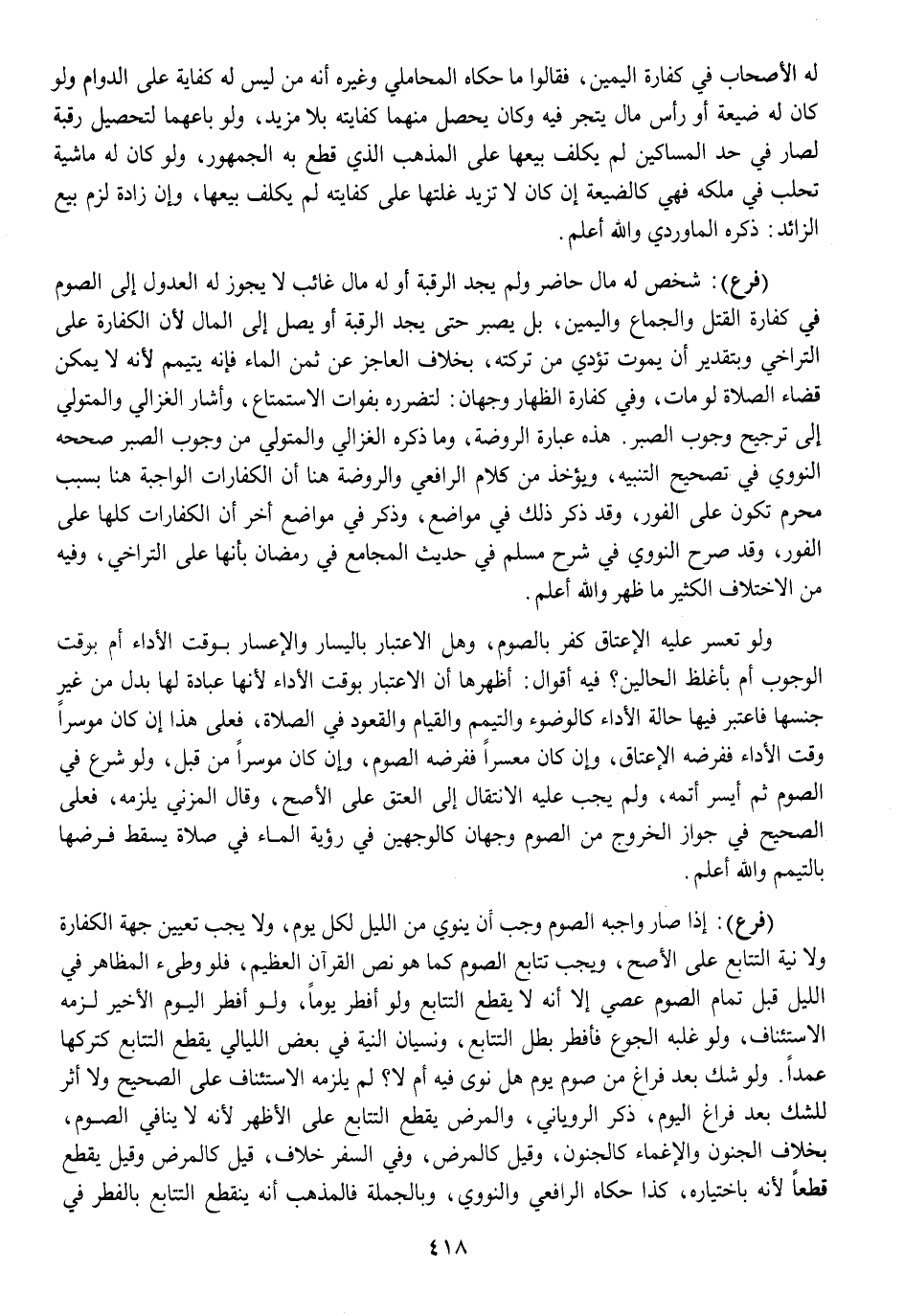 (فرع) شخص لَهُ مَال حَاضر وَلم يجد الرَّقَبَة أَو لَهُ مَال غَائِب لَا يجوز لَهُ الْعُدُول إِلَى الصَّوْم فِي كَفَّارَة الْقَتْل وَالْجِمَاع وَالْيَمِين بل يصبر حَتَّى يجد الرَّقَبَة أَو يصل إِلَى المَال لِأَن الْكَفَّارَة على التَّرَاخِي وَبِتَقْدِير أَن يَمُوت تُؤَدّى من تركته بِخِلَاف الْعَاجِز عَن ثمن المَاء فَإِنَّهُ يتَيَمَّم لِأَنَّهُ لَا يُمكن قَضَاء الصَّلَاة لَو مَاتَ وَفِي كَفَّارَة الظِّهَار وَجْهَان لتضرره بِفَوَات الِاسْتِمْتَاع وَأَشَارَ الْغَزالِيّ وَالْمُتوَلِّيّ إِلَى تَرْجِيح وجوب الصَّبْر هَذِه عبارَة الرَّوْضَة وَمَا ذكره الْغَزالِيّ وَالْمُتوَلِّيّ من وجوب الصَّبْر صَححهُ النَّوَوِيّ فِي تَصْحِيح التَّنْبِيه وَيُؤْخَذ من كَلَام الرَّافِعِيّ وَالرَّوْضَة هُنَا أَن الْكَفَّارَات الْوَاجِبَة هُنَا بِسَبَب محرم تكون على الْفَوْر وَقد ذكر ذَلِك فِي مَوَاضِع وَذكر فِي مَوَاضِع أخر أَن الْكَفَّارَات كلهَا على الْفَوْر وَقد صرح النَّوَوِيّ فِي شرح مُسلم فِي حَدِيث المجامع فِي رَمَضَان بِأَنَّهَا على التَّرَاخِي وَفِيه من الِاخْتِلَاف الْكثير مَا ظهر وَالله أعلم