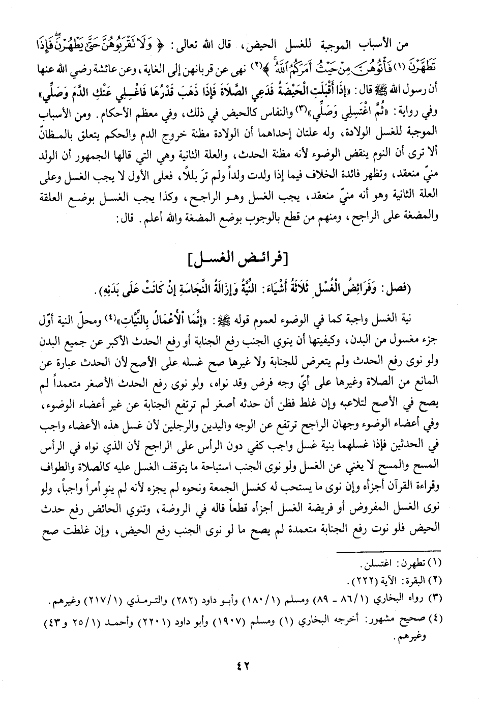 من الْأَسْبَاب الْمُوجبَة للْغسْل الْحيض قَالَ الله تَعَالَى {وَلَا تقربوهن حَتَّى يطهرن فَإِذا تطهرن فاتوهن من حَيْثُ أَمركُم الله} نهى عَن قربانهن إِلَى الْغَايَة وَعَن عَائِشَة رَضِي الله عَنْهَا أَن رَسُول الله صلى الله عَلَيْهِ وَسلم قَالَ