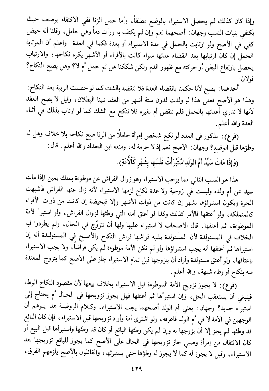 هَذَا هُوَ السَّبَب الثَّانِي مِمَّا يُوجب الِاسْتِبْرَاء وَهُوَ زَوَال الْفراش عَن مَوْطُوءَة بِملك يَمِين فَإِذا مَاتَ سيد عَن أم وَلَده وَلَيْسَت فِي زوجية وَلَا عدَّة نِكَاح لَزِمَهَا الِاسْتِبْرَاء لِأَنَّهُ زَالَ عَنْهَا الْفراش فَأَشْبَهت الْحرَّة وَيكون استبراؤها بِشَهْر إِن كَانَت من ذَوَات الْأَشْهر وَإِلَّا فبحيضة إِن كَانَت من ذَوَات الْأَقْرَاء كالمتملكة وَلَو أعْتقهَا فَالْأَمْر كَذَلِك وَكَذَا لَو أعتق أمته الَّتِي وَطئهَا لزوَال الْفراش وَلَو اسْتَبْرَأَ الْأمة الْمَوْطُوءَة ثمَّ أعْتقهَا قَالَ الْأَصْحَاب لَا اسْتِبْرَاء عَلَيْهَا وَلها أَن تتَزَوَّج فِي الْحَال وَلم يطردوا فِيهِ الْخلاف فِي الْمُسْتَوْلدَة لِأَن الْمُسْتَوْلدَة يشبه فراشها فرَاش النِّكَاح وَالأَصَح فِي الْمُسْتَوْلدَة أَنه إِن استبرأها ثمَّ أعْتقهَا أَنه يجب استبراؤها وَلَو لم تكن الْأمة مَوْطُوءَة لم يكن فراشا وَلَا يجب الِاسْتِبْرَاء بإعتاقها وَلَو أعتق مُسْتَوْلدَة وَأَرَادَ أَن يَتَزَوَّجهَا قبل تَمام الِاسْتِبْرَاء جَازَ على الْأَصَح كَمَا يتَزَوَّج الْمُعْتَدَّة مِنْهُ بِنِكَاح أَو وَطْء شُبْهَة وَالله أعلم