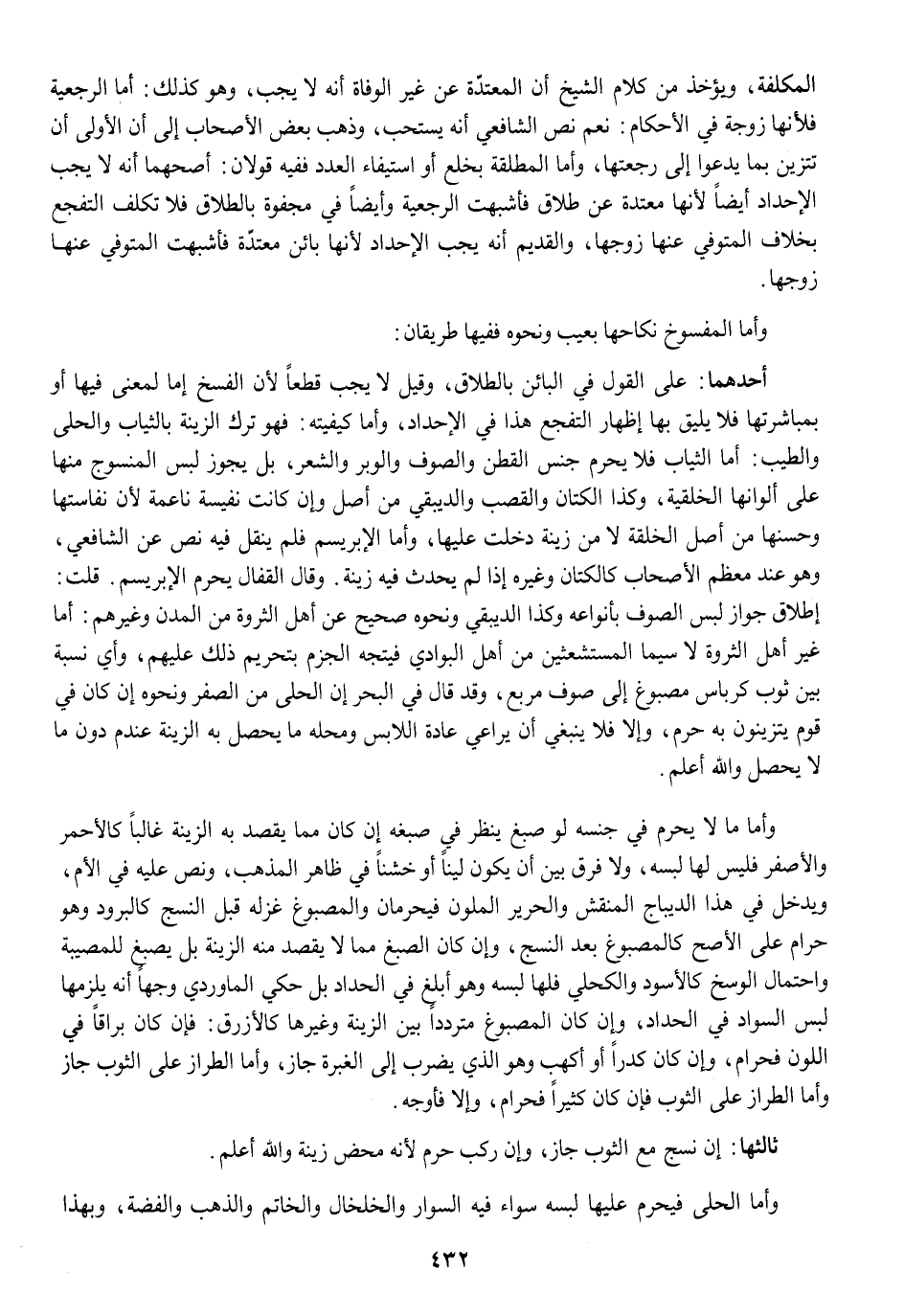 أَحدهمَا على القَوْل فِي الْبَائِن بِالطَّلَاق وَقيل لَا يجب قطعا لِأَن الْفَسْخ إِمَّا لِمَعْنى فِيهَا أَو بمباشرتها فَلَا يَلِيق بهَا إِظْهَار التفجع هَذَا فِي الْإِحْدَاد وَأما كيفيته فَهُوَ ترك الزِّينَة بالثياب والحلي وَالطّيب أما الثِّيَاب فَلَا يحرم جنس الْقطن وَالصُّوف والوبر وَالشعر بل يجوز لبس المنسوج مِنْهَا على ألوانها الخلقية وَكَذَا الْكَتَّان والقصب والديبقي من أصل وَإِن كَانَت نفيسة ناعمة لِأَن نفاستها وحسنها من أصل الْخلقَة لَا من زِينَة دخلت عَلَيْهَا وَأما الابريسم فَلم ينْقل فِيهِ نَص عَن الشَّافِعِي وَهُوَ عِنْد مُعظم الْأَصْحَاب كالكتان وَغَيره إِذا لم يحدث فِيهِ زِينَة وَقَالَ الْقفال يحرم الإبريسم قلت إِطْلَاق جَوَاز لبس الصُّوف بأنواعه وَكَذَا الديبقي وَنَحْوه صَحِيح عَن أهل الثروة من المدن وَغَيرهم أما غير أهل الثوره لاسيما المستثعثين من أهل الْبَوَادِي فَيتَّجه الْجَزْم بِتَحْرِيم ذَلِك عَلَيْهِم وَأي نِسْبَة بَين ثوب كرباس مصبوغ إِلَى صوف مربع وَقد قَالَ فِي الْبَحْر إِن الحلى من الصفر وَنَحْوه إِن كَانَ فِي قوم يتزينون بِهِ حرم وَإِلَّا فَلَا يَنْبَغِي أَن يُرَاعى عَادَة اللابس وَمحله مَا يحصل بِهِ الزِّينَة عِنْدهم دون مَا لَا يحصل وَالله أعلم