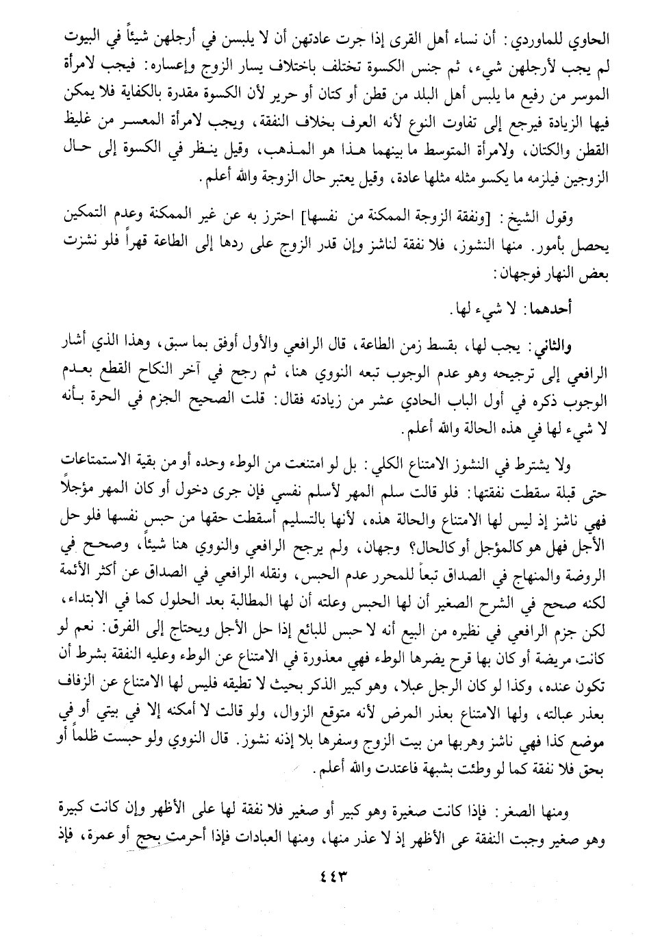 الْحَاوِي للماوردي أَن نسَاء أهل الْقرى إِذا جرت عادتهن أَن لَا يلبسن فِي أرجلهن شَيْئا فِي الْبيُوت لم يجب لأرجلهن شَيْء ثمَّ جنس الْكسْوَة تخْتَلف باخْتلَاف يسَار الزَّوْج وإعساره فَيجب لامْرَأَة الْمُوسر من رفيع مَا يلبس أهل الْبَلَد من قطن أَو كتَّان أَو حَرِير لِأَن الْكسْوَة مقدرَة بالكفاية فَلَا يُمكن فِيهَا الزِّيَادَة فَيرجع إِلَى تفَاوت النَّوْع لِأَنَّهُ الْعرف بِخِلَاف النَّفَقَة وَيجب لامْرَأَة الْمُعسر من غليظ الْقطن والكتنان ولامرأة الْمُتَوَسّط مَا بَينهمَا هَذَا هُوَ الْمَذْهَب وَقيل ينظر فِي الْكسْوَة إِلَى حَال الزَّوْجَيْنِ فَيلْزمهُ مَا يكسو مثله مثلهَا عَادَة وَقيل يعْتَبر حَال الزَّوْجَة وَالله أعلم