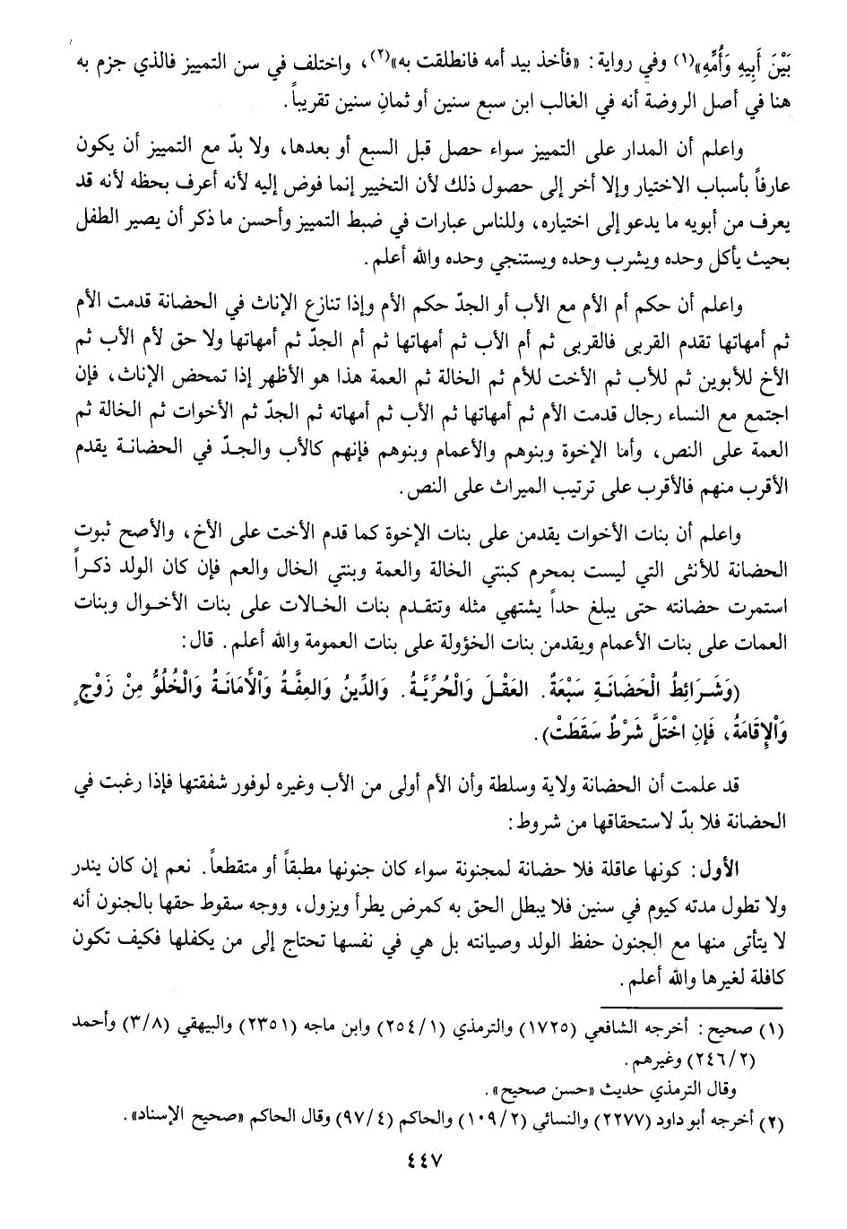 وَاعْلَم أَن الْمدَار على التَّمْيِيز سَوَاء حصل قبل السَّبع أَو بعْدهَا وَلَا بُد مَعَ التَّمْيِيز أَن يكون عَارِفًا بِأَسْبَاب الِاخْتِيَار وَإِلَّا أخر إِلَى حُصُول ذَلِك لِأَن التخييز غنما فوض إِلَيْهِ لِأَنَّهُ أعرف بحظه لِأَنَّهُ قد يعرف من أَبَوَيْهِ مَا يَدْعُو إِلَى اخْتِيَاره وَلِلنَّاسِ عِبَارَات فِي ضبط التَّمْيِيز وَأحسن مَا ذكر أَن يصير الطِّفْل بِحَيْثُ يَأْكُل وَحده وَيشْرب وَحده ويستنجي وَحده وَالله أعلم