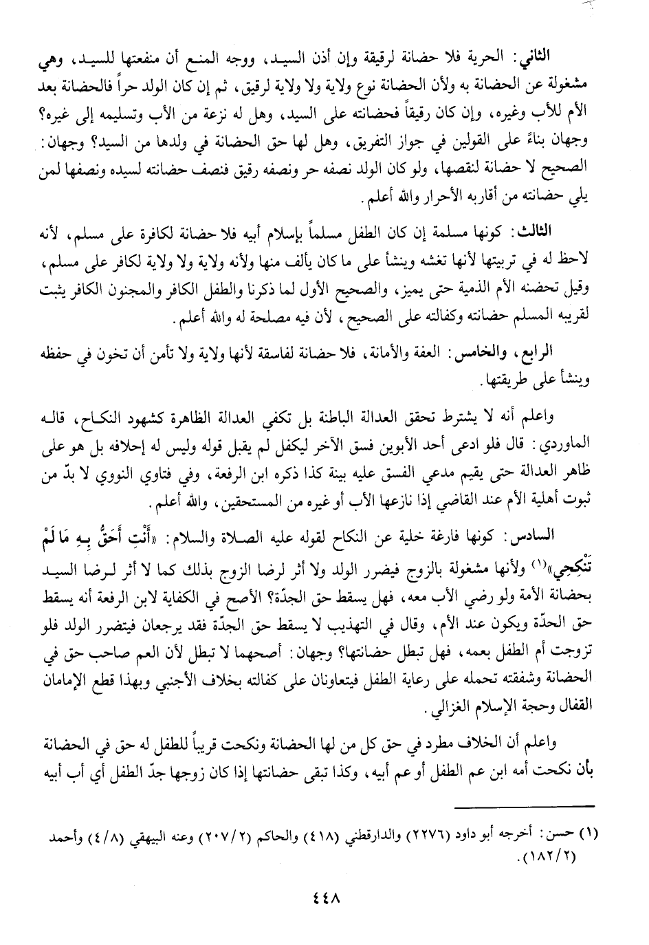 الثَّانِي الْحُرِّيَّة فَلَا حضَانَة لرقيقة وَإِن أذن السَّيِّد وَوجه الْمَنْع أَن مَنْفَعَتهَا للسَّيِّد وَهِي مَشْغُولَة عَن الْحَضَانَة بِهِ وَلِأَن الْحَضَانَة نوع ولَايَة وَلَا ولَايَة لرقيق ثمَّ إِن كَانَ الْوَلَد حرا فالحضانة بعد الْأُم للْأَب وَغَيره وَإِن كَانَ رَقِيقا فحضانته على السَّيِّد وَهل لَهُ نَزعَة من الْأَب وتسليمه إِلَى غَيره وَجْهَان بِنَاء على الْقَوْلَيْنِ فِي جَوَاز التَّفْرِيق وَهل لَهَا حق الْحَضَانَة فِي وَلَدهَا من السَّيِّد وَجْهَان الصَّحِيح لَا حضَانَة لنقصها وَلَو كَانَ الْوَلَد نصفه حر وَنصفه رَقِيق فَنصف حضانته لسَيِّده وَنِصْفهَا لمن يَلِي حضانته من أَقَاربه الْأَحْرَار وَالله أعلم