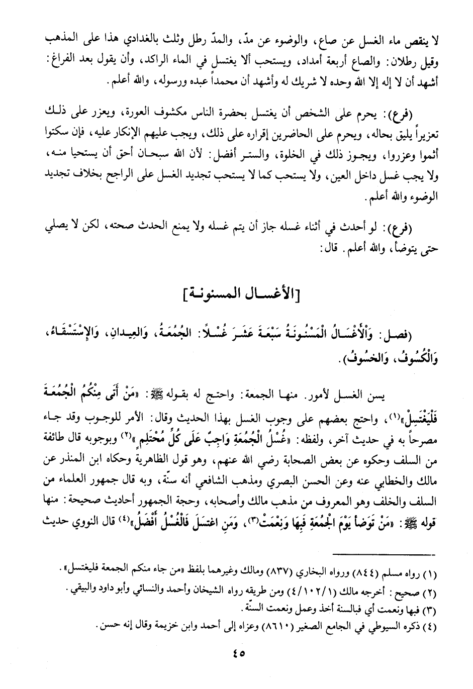يسن الْغسْل لأمور مِنْهَا الْجُمُعَة وَاحْتج لَهُ بقوله صلى الله عَلَيْهِ وَسلم