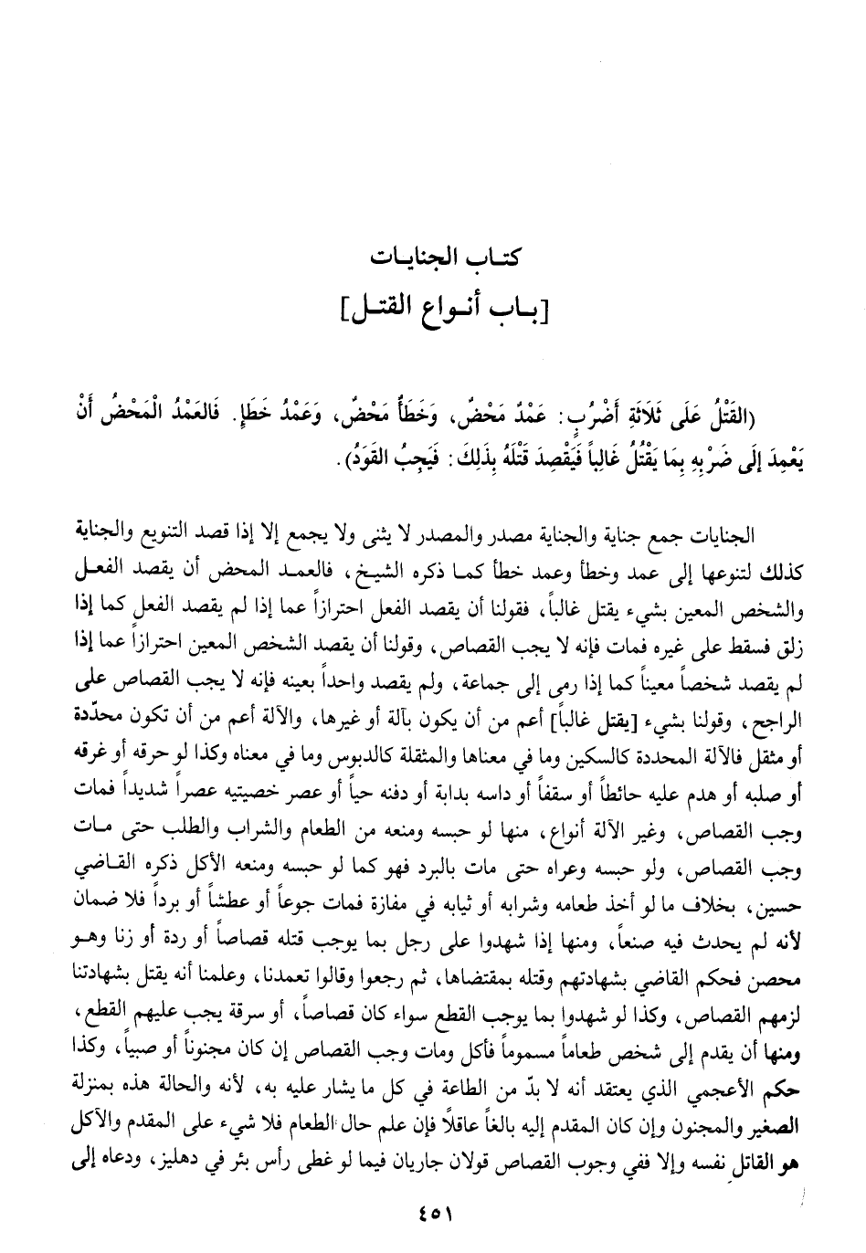 الْجِنَايَات جمع جِنَايَة وَالْجِنَايَة مصدر والمصدر لَا يثنى وَلَا يجمع إِلَّا إِذا قصد التنويع وَالْجِنَايَة كَذَلِك لتنوعها إِلَى عمد وَخطأ وَعمد خطأ كَمَا ذكره الشَّيْخ فالعمد الْمَحْض أَن يقْصد الْفِعْل والشخص الْمعِين بِشَيْء يقتل غَالِبا فقولنا أَن يقْصد الْفِعْل احْتِرَازًا عَمَّا إِذا لم يقْصد الْفِعْل كَمَا إِذا زلق فَسقط على غَيره فَمَاتَ فَإِنَّهُ لَا يجب الْقصاص وَقَوْلنَا أَن يقْصد الشَّخْص الْمعِين احْتِرَازًا عَمَّا إِذا لم يقْصد شخصا معينا كَمَا إِذا رمى إِلَى جمَاعَة وَلم يقْصد وَاحِدًا بِعَيْنِه فَإِنَّهُ لَا يجب الْقصاص على الرَّاجِح وَقَوْلنَا بِشَيْء يقتل غَالِبا أَعم من أَن يكون بِآلَة أَو غَيرهَا والآلة أَعم من أَن تكون محددة أَو مثقل فالآلة المحددة كالسكين وَمَا فِي مَعْنَاهَا والمثقلة كالدبوس وَمَا فِي مَعْنَاهُ وَكَذَا لَو حرقه أَو غرقه أَو صلبه أَو هدم عَلَيْهِ حَائِطا أَو سقفاً أَو داسه بِدَابَّة أَو دَفنه حَيا أَو عصر خصيتيه عصراً شَدِيدا فَمَاتَ وَجب الْقصاص وَغير الْآلَة أَنْوَاع مِنْهَا لَو حَبسه وَمنعه من الطَّعَام وَالشرَاب والطلب حَتَّى مَاتَ وَجب الْقصاص وَلَو حَبسه وعراه حَتَّى مَاتَ بالبرد فَهُوَ كَمَا لَو حَبسه وَمنعه الْأكل ذكره القَاضِي حُسَيْن بِخِلَاف مَا لَو أَخذ طَعَامه وَشَرَابه أَو ثِيَابه فِي مفازة فَمَاتَ جوعا أَو عطشاً أَو بردا فَلَا ضَمَان لِأَنَّهُ لم يحدث فِيهِ صنعا وَمِنْهَا إِذا شهدُوا على رجل بِمَا يُوجب قَتله قصاصا أَو ردة أَو زنا وَهُوَ مُحصن فَحكم القَاضِي بِشَهَادَتِهِم وَقَتله بمقتضاها ثمَّ رجعُوا وَقَالُوا تعمدنا وَعلمنَا أَنه يقتل بشهادتنا لَزِمَهُم الْقصاص وَكَذَا لَو شهدُوا بِمَا يُوجب الْقطع سَوَاء كَانَ قصاصا أَو سَرقَة يجب عَلَيْهِم الْقطع وَمِنْهَا أَن يقدم إِلَى الشَّخْص طَعَاما مسموما فَأكل وَمَات وَجب الْقصاص إِن كَانَ مَجْنُونا أَو صَبيا وَكَذَا حكم الأعجمي الَّذِي يعْتَقد أَنه لَا بُد من الطَّاعَة فِي كل مَا يشار عَلَيْهِ بِهِ لِأَنَّهُ وَالْحَالة هَذِه بِمَنْزِلَة الصَّغِير وَالْمَجْنُون وَإِن كَانَ الْمُقدم إِلَيْهِ بَالغا عَاقِلا فَإِن علم حَال الطَّعَام فَلَا شَيْء على الْمُقدم والآكل هُوَ الْقَاتِل نَفسه وَإِلَّا فَفِي وجوب الْقصاص قَولَانِ جاريان فِيمَا لَو غطى رَأس بِئْر فِي دهليز وَدعَاهُ إِلَى