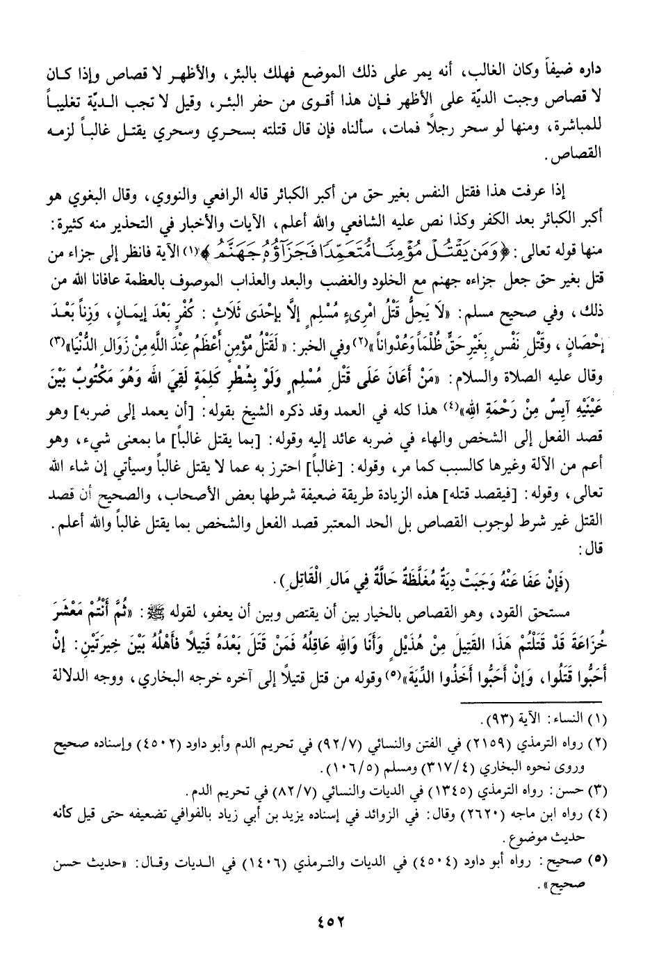 إِذا عرفت هَذَا فَقتل النَّفس بِغَيْر حق من أكبر الْكَبَائِر قَالَه الرَّافِعِيّ وَالنَّوَوِيّ وَقَالَ الْبَغَوِيّ هُوَ أكبر الْكَبَائِر بعد الْكفْر وَكَذَا نَص عَلَيْهِ الشَّافِعِي وَالله أعلم الْآيَات وَالْأَخْبَار فِي التحذير مِنْهُ كَثِيرَة مِنْهَا قَوْله تَعَالَى {وَمَنْ يَقْتُلْ مُؤْمِناً مُتَعَمِّداً فَجَزَاؤُهُ جَهَنَّمُ} الْآيَة فَانْظُر إِلَى جَزَاء من قتل بِغَيْر حق جعل جزاءه جَهَنَّم مَعَ الخلود وَالْغَضَب والبعد وَالْعَذَاب الْمَوْصُوف بالعظمة عَافَانَا الله من ذَلِك وَفِي صَحِيح مُسلم لَا يحل قتل امْرِئ مُسلم إِلَّا بِإِحْدَى ثَلَاث كفر بعد إِيمَان وزنا بعد إِحْصَان وَقتل نفس بِغَيْر حق ظلما وعدواناً وَفِي الْخَبَر لقتل مُؤمن أعظم عِنْد الله من زَوَال الدُّنْيَا وَقَالَ عَلَيْهِ الصَّلَاة وَالسَّلَام من أعَان على قتل مُسلم وَلَو بِشَطْر كلمة لَقِي الله وَهُوَ مَكْتُوب بَين عَيْنَيْهِ آيس من رَحْمَة الله هَذَا كُله فِي الْعمد وَقد ذكره الشَّيْخ بقوله أَن يعمد إِلَى ضربه وَهُوَ قصد الْفِعْل إِلَى الشَّخْص وَالْهَاء فِي ضربه عَائِد إِلَيْهِ وَقَوله بِمَا يقتل غَالِبا مَا بِمَعْنى شَيْء وَهُوَ أَعم من الْآلَة وَغَيرهَا كالسبب كَمَا مر وَقَوله غَالِبا احْتَرز بِهِ عَمَّا لَا يقتل غَالِبا وَسَيَأْتِي إِن شَاءَ الله تَعَالَى وَقَوله فيقصد قَتله هَذِه الزِّيَادَة طَريقَة ضَعِيفَة شَرطهَا بعض الْأَصْحَاب وَالصَّحِيح أَن قصد الْقَتْل غير شَرط لوُجُوب الْقصاص بل الْحَد الْمُعْتَبر قصد الْفِعْل والشخص بِمَا يقتل غَالِبا وَالله أعلم قَالَ