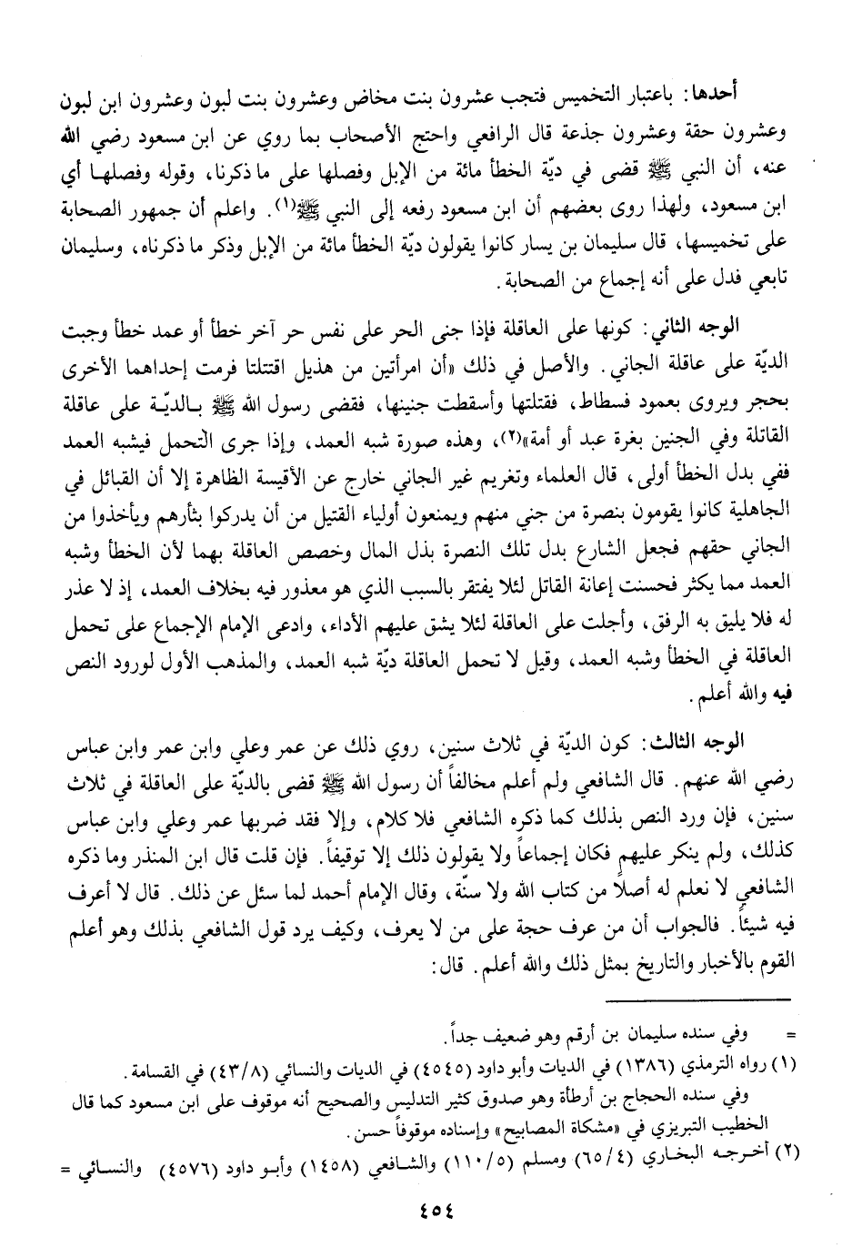 الْوَجْه الثَّالِث كَون الدِّيَة فِي ثَلَاث سِنِين رُوِيَ ذَلِك عَن عمر وَعلي وَابْن عمر وَابْن عَبَّاس رَضِي الله عَنْهُم قَالَ الشَّافِعِي وَلم أعلم مُخَالفا أَن رَسُول الله صلى الله عَلَيْهِ وَسلم قضى بِالدِّيَةِ على الْعَاقِلَة فِي ثَلَاث سِنِين فَإِن ورد النَّص بذلك كَمَا ذكره الشَّافِعِي فَلَا كَلَام وَإِلَّا فقد ضربهَا عمر وَعلي وَابْن عَبَّاس كَذَلِك وَلم يُنكر عَلَيْهِم فَكَانَ إِجْمَاعًا وَلَا يَقُولُونَ ذَلِك إِلَّا توقيفاً فَإِن قلت قَالَ ابْن الْمُنْذر وَمَا ذكره الشَّافِعِي لَا نعلم لَهُ أصلا من كتاب الله وَلَا سنة وَقَالَ الإِمَام أَحْمد لما سُئِلَ عَن ذَلِك قَالَ لَا أعرف فِيهِ شَيْئا فَالْجَوَاب أَن من عرف حجَّة على من لَا يعرف وَكَيف يرد قَول الشَّافِعِي بذلك وَهُوَ أعلم الْقَوْم بالأخبار والتاريخ بِمثل ذَلِك وَالله أعلم قَالَ