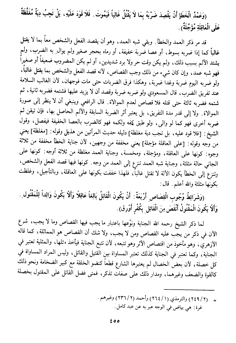 قد مر ذكر الْعمد وَالْخَطَأ وَبَقِي شبه الْعمد وَهُوَ أَن يقْصد الْفِعْل والشخص مَعًا بِمَا لَا يقتل غَالِبا كَمَا إِذا ضربه بِسَوْط أَو عَصا ضَرْبَة خَفِيفَة أَو رَمَاه بِحجر صَغِير وَلم يوال بِهِ الضَّرْب وَلم يشْتَد الْأَلَم بِسَبَب ذَلِك وَلم يكن وَقت حر وَلَا برد شديدين أَو لم يكن الْمَضْرُوب ضَعِيفا أَو صَغِيرا فَهُوَ شبه عمد وَإِن كَانَ شَيْء من ذَلِك وَجب الْقصاص لِأَنَّهُ قصد الْفِعْل والشخص بِمَا يقتل غَالِبا وَلَو ضربه الْيَوْم ضَرْبَة وَغدا ضَرْبَة وَهَكَذَا فرق الضربات حَتَّى مَاتَ فَوَجْهَانِ لِأَن الْغَالِب السَّلامَة عِنْد تَفْرِيق الضَّرْب قَالَ المَسْعُودِيّ وَلَو ضربه ضَرْبَة وَقصد أَن لَا يزِيد عَلَيْهَا فشتمه فَضَربهُ ثَانِيَة ثمَّ شَتمه فَضَربهُ ثَالِثَة حَتَّى قَتله فَلَا قصاص لعدم الْمُوَالَاة قَالَ الرَّافِعِيّ وَيَنْبَغِي أَن لَا ينظر إِلَى صُورَة الْمُوَالَاة وَلَا إِلَى قدر مُدَّة التَّفْرِيق بل يعْتَبر أثر الضَّرْبَة السَّابِقَة والألم الْحَاصِل بهَا فَإِن تَيَقّن ثمَّ ضربه أُخْرَى فَهُوَ كَمَا لَو والى وَلَو طبق كَفه ولكمه فَهُوَ كالضرب بالعصا الْخَفِيفَة فيفصل وَقَول الشَّيْخ فَلَا قَود عَلَيْهِ بل تجب دِيَة مُغَلّظَة دَلِيله حَدِيث الْمَرْأَتَيْنِ من هُذَيْل وَقَوله مُغَلّظَة يَعْنِي من وَجه وَقَوله على الْعَاقِلَة مُؤَجّلَة يَعْنِي مُخَفّفَة من وَجْهَيْن لِأَن جِنَايَة الْخَطَأ مُخَفّفَة من ثَلَاثَة وُجُوه كَونهَا على الْعَاقِلَة ومؤجلة ومخمسة وَجِنَايَة الْعمد مُغَلّظَة من ثَلَاثَة أوجه كَونهَا على الجانس حَالَة مُثَلّثَة وَجِنَايَة شبه الْعمد تنْزع إِلَى الْعمد من وَجه كَونهَا فِيهَا قصد الْفِعْل والشخص وتنزع إِلَى الْخَطَأ يكون الْآلَة لَا تقتل غَالِبا فَلهَذَا خففت بِكَوْنِهَا على الْعَاقِلَة وبالتأجيل وغلظت بِكَوْنِهَا مُثَلّثَة وَالله أعلم قَالَ