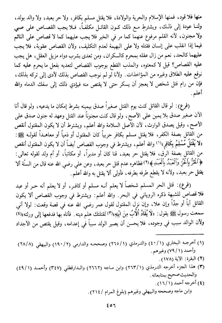 مِنْهَا فَلَا قَود فَمِنْهَا الْإِسْلَام وَالْحريَّة والولادة فَلَا يقتل مُسلم بِكَافِر وَلَا حر بِعَبْد وَلَا وَالِد بِولد وَلنَا عودة إِلَى ذَلِك وَيشْتَرط مَعَ ذَلِك كَون الْقَاتِل مُكَلّفا فَلَا يجب الْقصاص على صبي وَلَا مَجْنُون لِأَنَّهُ الْقَلَم مَرْفُوع عَنْهُمَا كَمَا مر فِي الْخَبَر فَلَا يجب عَلَيْهِمَا كَمَا لَا قصاص على النَّائِم فِيمَا إِذا انْقَلب على إِنْسَان فَقتله وَلَا على الْبَهِيمَة لعدم التَّكْلِيف وَلِأَن الْقصاص عُقُوبَة فَلَا يجب عَلَيْهِمَا كالحد نعم من زَالَ عقله بِمحرم كَالسَّكْرَانِ وَمن تعدى بِشرب دَوَاء مزيل الْعقل هَل يجب عَلَيْهِ الْقصاص قيل لَا كمعتوه والمذب الْقطع بِوُجُوب الْقصاص لتعديه بِفعل مَا يحرم عَلَيْهِ كَمَا نوقع عَلَيْهِ الطَّلَاق وَغَيره من المؤاخذات ولأنا لَو لم نوجب الْقصاص بذلك لَأَدَّى إِلَى تَركه بذلك فَإِن من رام قتل شخص لَا يعجز أَن يسكر حَتَّى لَا يقْتَصّ مِنْهُ فَيُؤَدِّي ذَلِك إِلَى سفك الدِّمَاء وَالله أعلم